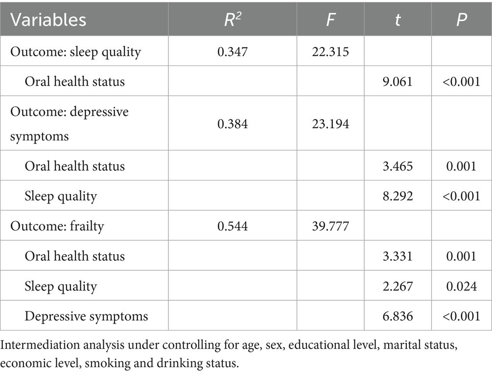 Results: This study showed a positive correlation between oral health status, sleep quality, depressive symptoms and frailty (r = 0.457 ~ 0.583; all p < 0.001), the indirect effects of oral health status on frailty mediated by sleep quality, depressive symptoms were 0.073 (95% CI = [0.002 ~ 0.144]), 0.085 (95%CI = [0.032 ~ 0.148]), the effect mediated by both sleep quality and depressive symptoms was 0.090 (95%CI = [0.049 ~ 0.148]). The total indirect effect value of sleep quality and depressive symptoms between oral health status and frailty was 0.248 (95% CI = [0.161 ~ 0.347]), accounting for 52.54% of the total effect.