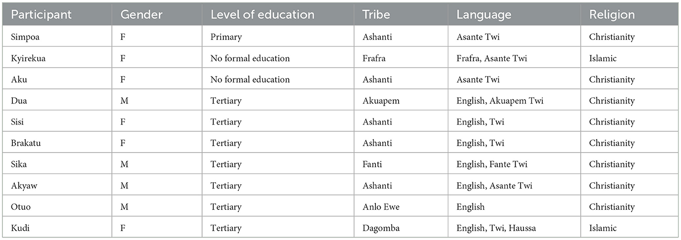 Face-to-face semi-structured interviews were conducted by the researcher and trained research assistants with experience in qualitative interviews. All interviews were audio-recorded with participants' permission. Only the researcher, research assistants, and interviewees were present during the sessions. Interviews were conducted in English and “Asante Twi” languages.