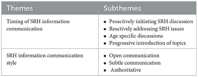 Findings: Two broad themes emerged: timing of sexual and reproductive health information communication and sexual and reproductive health information communication style. This study highlights varying parental approaches to sexual and reproductive health communication, ranging from proactive and open to authoritative communication.
