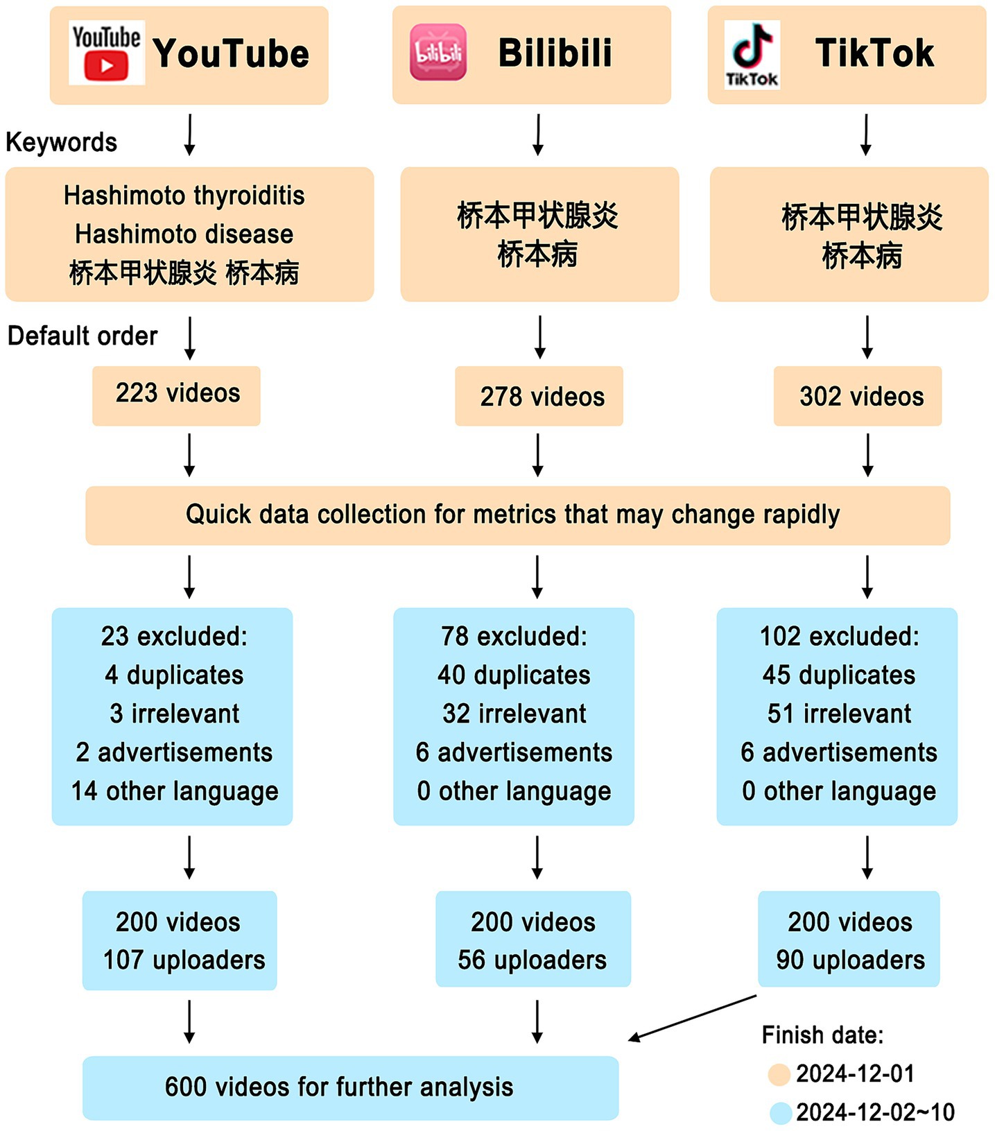 Flowchart comparing YouTube, Bilibili, and TikTok video data for Hashimoto thyroiditis keywords. YouTube starts with 223 videos, excluding 23, resulting in 200 videos from 107 uploaders. Bilibili begins with 278 videos, excluding 78, yielding 200 videos from 56 uploaders. TikTok initiates with 302 videos, excluding 102, resulting in 200 videos from 90 uploaders. Overall, 600 videos progress for further analysis. Finish dates noted are December 1, 2024, and December 2-10, 2024.