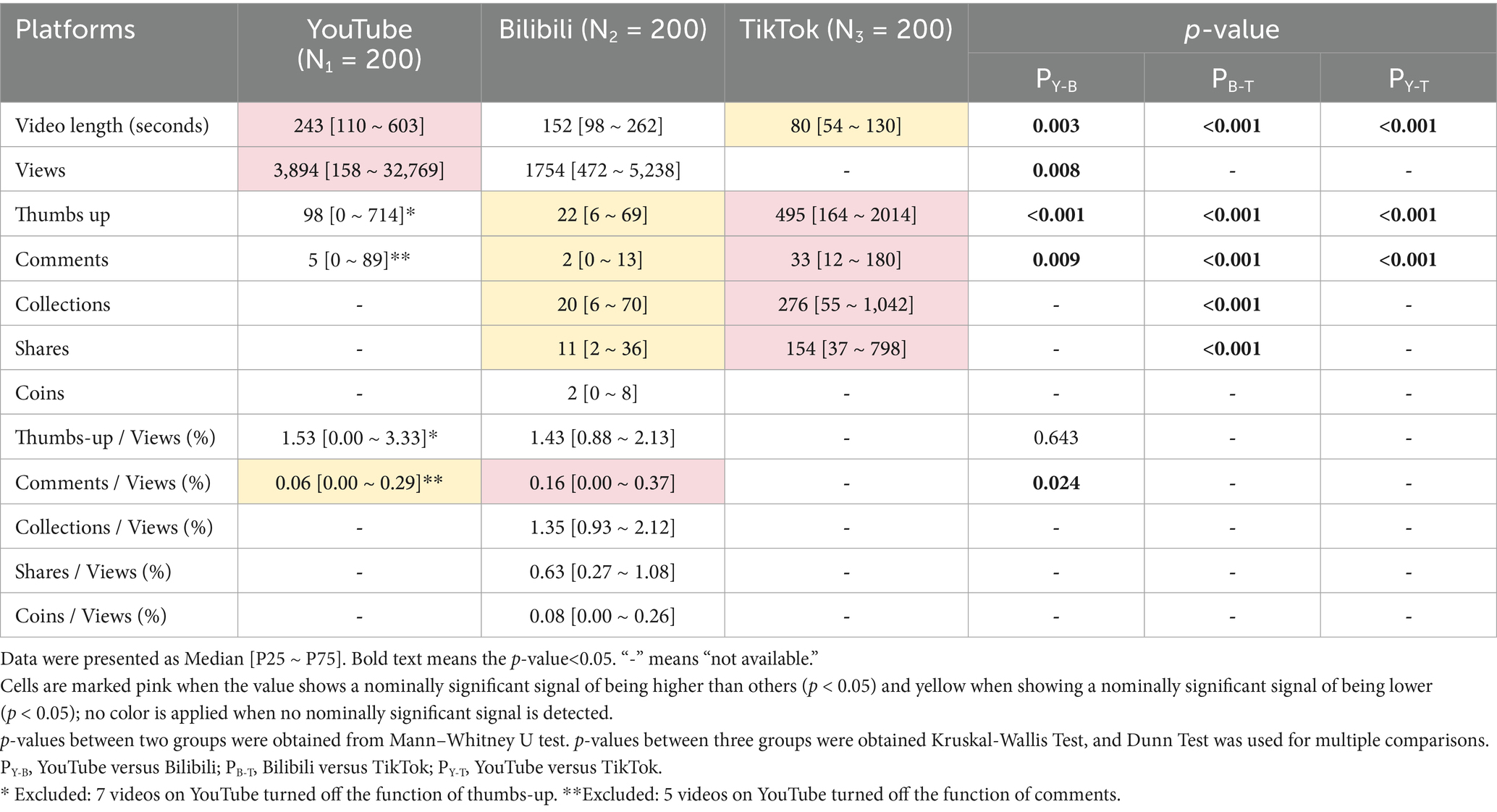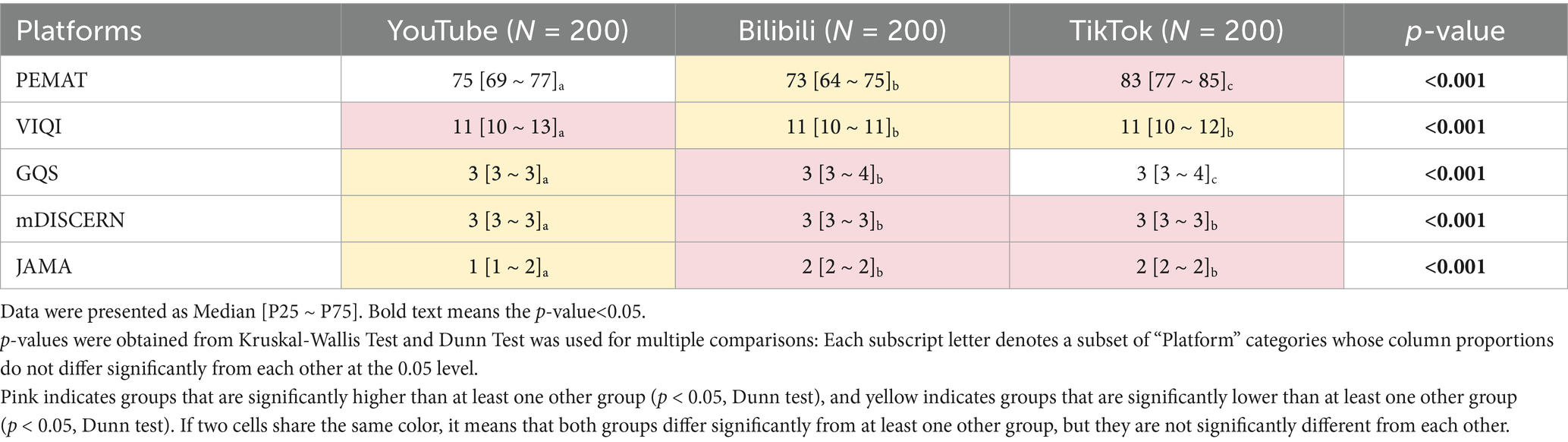 After applying the inclusion and exclusion criteria, the top 200 videos retrieved under default search settings using a newly registered user account were included for each platform, because users typically scroll through approximately 100 ~ 200 recommended videos for a given keyword (17, 18). Statistical testing confirmed that all continuous variables exhibited non-normal distributions (Shapiro–Wilk test, p-value < 0.05). YouTube videos demonstrated the longest durations. Due to the restrictions of each platform, some data were not available. TikTok achieved the highest levels of user engagement, as indicated by likes, comments, collections, and shares. Interestingly, despite YouTube having a higher amount of views, thumbs up and comments compared to Bilibili, the ratio of comments to views was lower than that of Bilibili (Table 1).