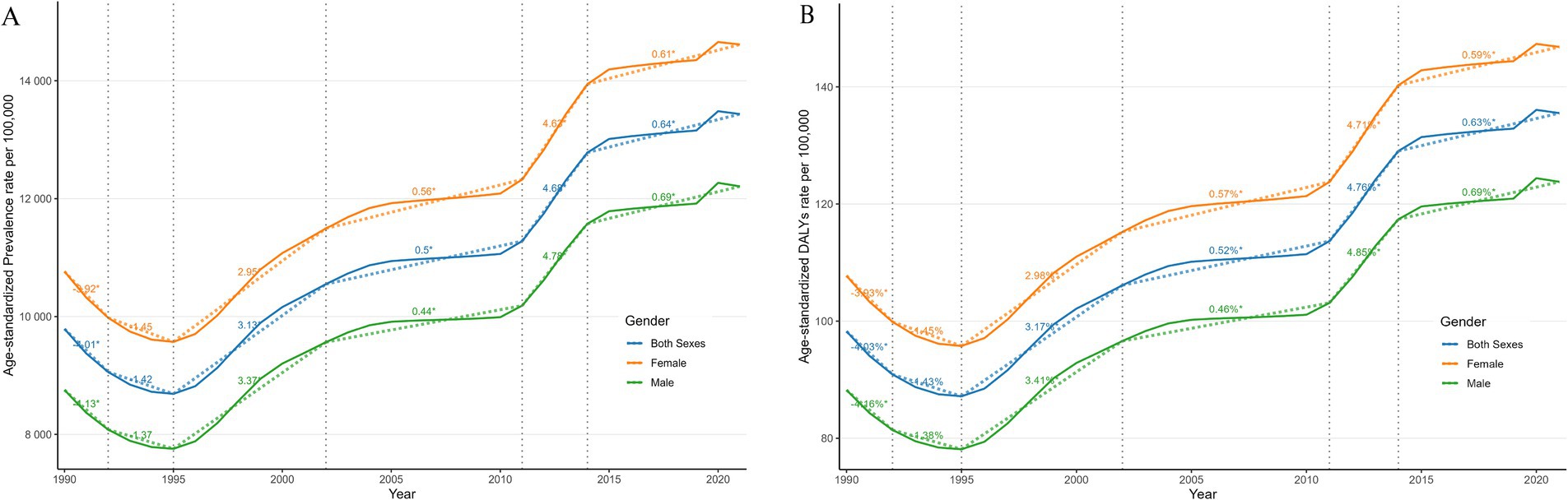 Gender-specific analysis revealed that males exhibited slightly higher growth rates in both ASPR (EAPC = 1.52) and age-standardized DALYs (EAPC = 1.55) than females (1.44 and 1.46, respectively). However, females consistently demonstrated higher ASPR and age-standardized DALYs than males over the 30-year study period (Table 1 and Figures 1A,B). Segmented APC analysis indicated that ASPR and age-standardized DALYs experienced a brief decline from 1990 to 1992, reached peak growth rates from 1995 to 2002, showed a resurgence from 2011 to 2014, followed by a deceleration in growth.