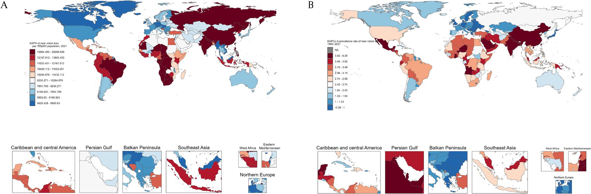 Figure 3. Global maps of NVL prevalence in 2021 (A) and the EAPC from 1990 to 2021 (B). EAPC, estimated annual percentage change.