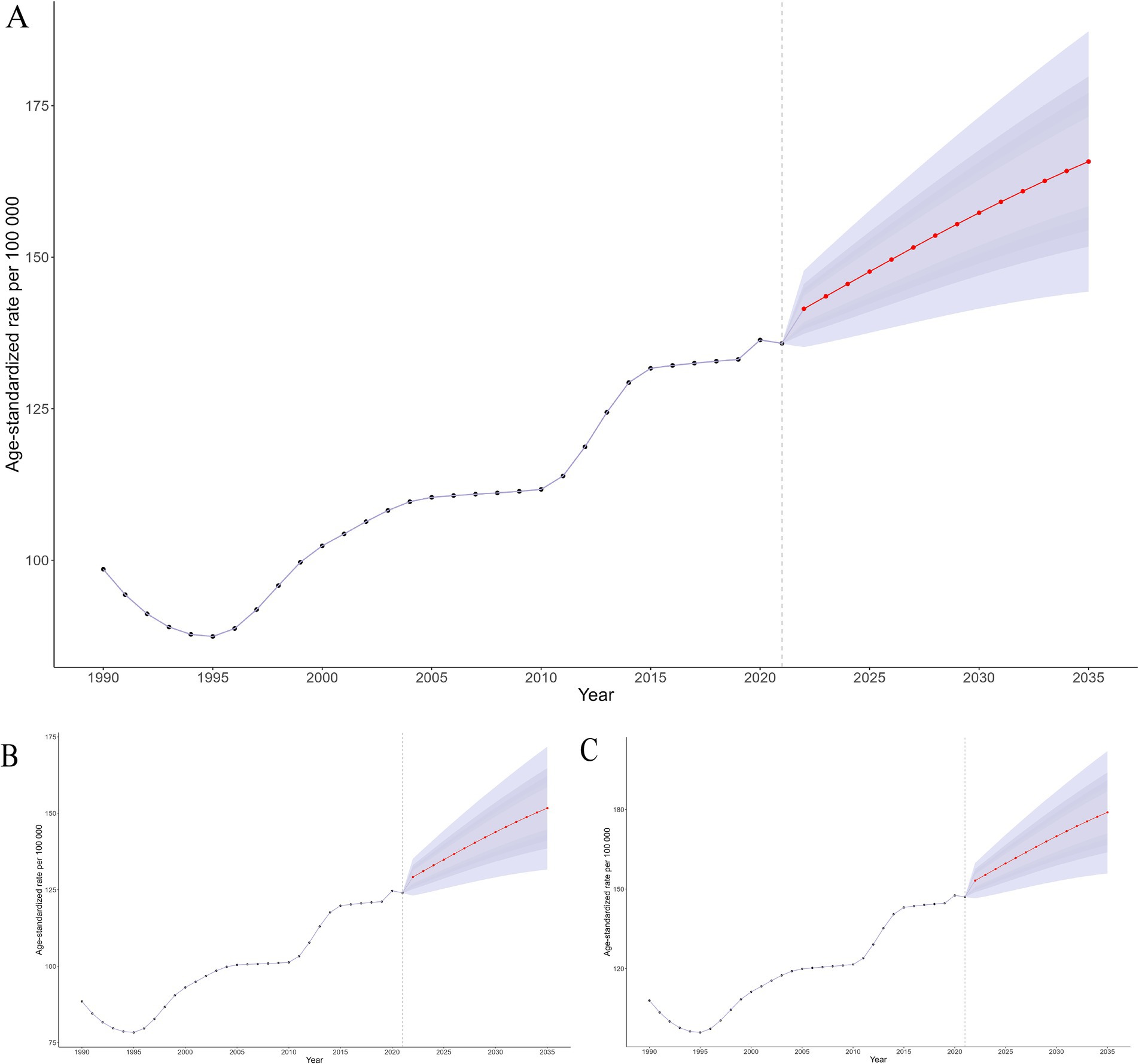 Figure 8. Future projections and temporal trends in ASPR from 1990 to 2035 for global (A), male (B), and female (C).