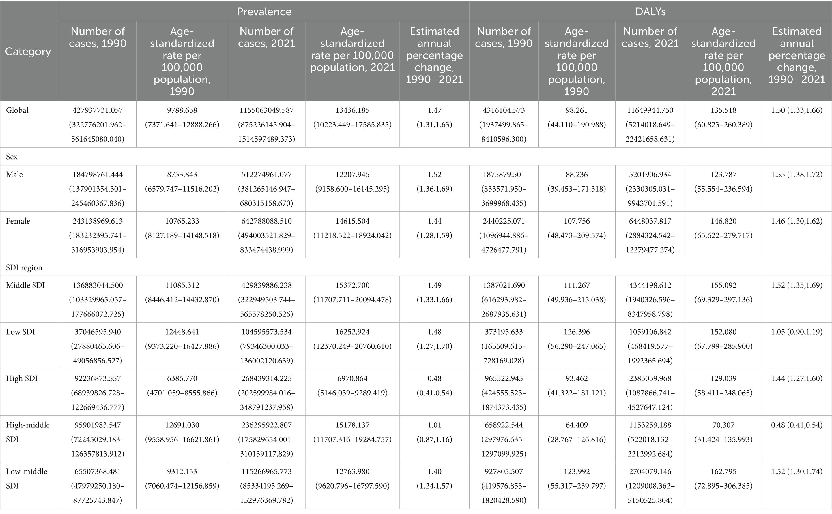 Table 1. Global, sex-specific, and SDI region–specific NVL prevalence and DALY metrics in 1990 and 2021, including the number of cases, age-standardized rates (per 100,000 population), and the estimated annual percentage change (EAPC) from 1990 to 2021.