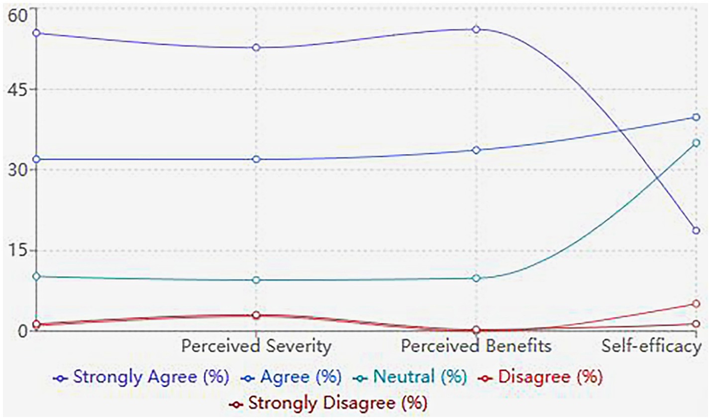 As shown in Figure 1, although perceived susceptibility and benefits were high, this did not translate to action, challenging the assumptions of the HBM. The identified barriers – time constraints (50.34% found it difficult to allocate time for hospital visits), cost (25.17% considered the cost burdensome) and knowledge gaps (21.43% reported inadequate understanding of fertility preservation) – provide concrete targets for policy and education programmes. Notably, only 54.42% expressed confidence in maintaining lifestyle changes, revealing an underappreciated challenge in sustained behaviour modification.
