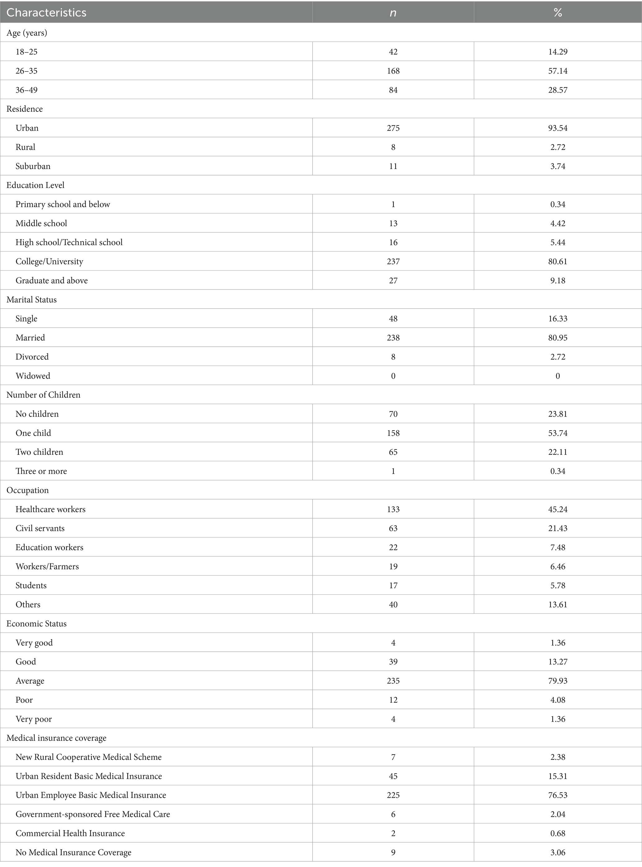Among the 294 participants, the majority were urban residents (93.54%) with an average age of childbearing years. It showed a highly educated sample (80.61% college-educated), with healthcare workers representing the largest occupational group (45.24%), providing a unique perspective on a population with presumably greater health literacy (see Table 1 for details).