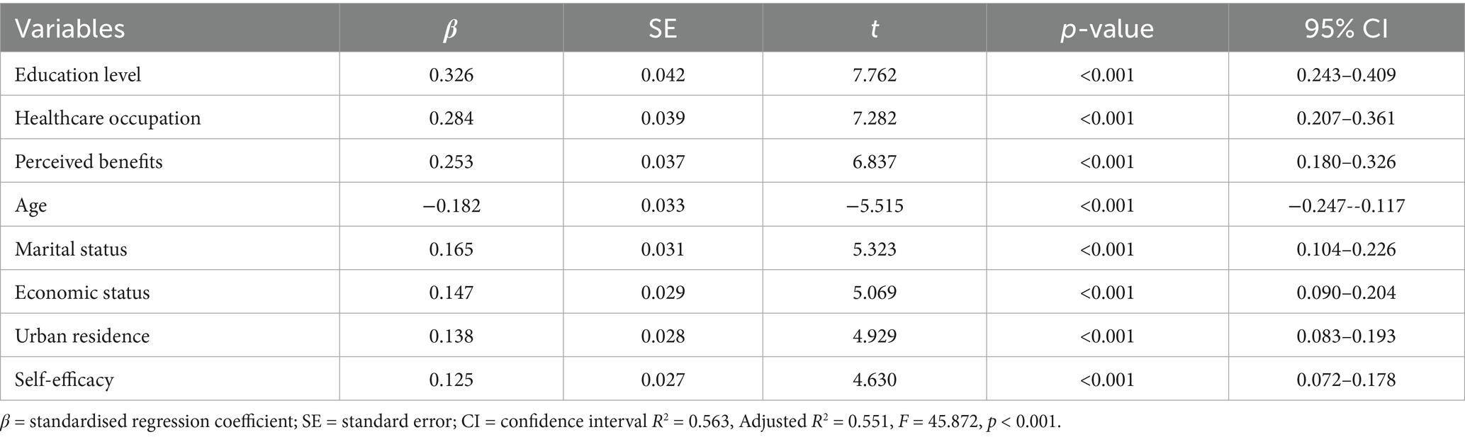 Multiple linear regression analysis revealed several significant predictors of fertility preservation behaviours (see Table 2). Education level (β = 0.326, p < 0.001), healthcare occupation (β = 0.284, p < 0.001) and perceived benefits (β = 0.253, p < 0.001) were positively associated with protective behaviours.