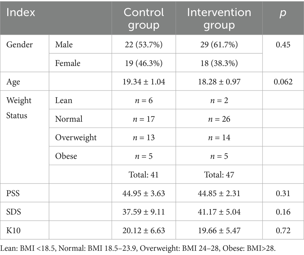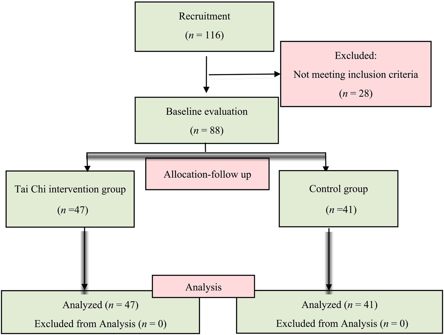 Sample size was determined from prior evidence (PMID: 25686304) indicating that a standardized mindful awareness practices intervention produced significant improvements in sleep quality, a stress-related outcome. Using G*Power for a two-tailed test (α = 0.05, Cohen’s d = 0.80), we estimated that 26 participants per group would be required. To ensure adequate power, we set a target sample size of 88 and subsequently randomized 88 university students to either a Tai Chi intervention group (n = 47), assigned to regular 24-form Yang-style Tai Chi practice, or a control group (n = 41) instructed to maintain their usual lifestyles (19). The intervention group received 4 weeks of foundational training from a senior Tai Chi instructor (20 years’ teaching experience), followed by a structured 16-week intervention (3 sessions/week, 90 min/session). Each session comprised: (1) 10-min warm-up (gentle stretching and breathing exercises), (2) 70-min core Tai Chi practice, and (3) 10-min cool-down (meditation and slow walking). All participants resided within the same closed-campus community. Adherence was ensured through dual oversight: a certified Tai Chi master/research assistant supervised all sessions, and participants signed standardized attendance sheets at every meeting.
