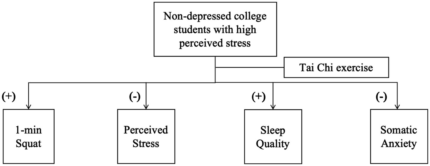 To interpret these findings, a multidimensional framework encompassing biomechanical, neurophysiological, and psychosocial pathways can be proposed. While the present design does not allow for causal inference, the interrelationships between these pathways offer a plausible, theoretical model for understanding Tai Chi’s potential effects. First, on a biomechanical level, the significant improvement in lower-limb muscular endurance is consistent with the demands of Tai Chi’s characteristic sustained, knee-flexed postures, which engage the quadriceps and related muscle groups (59). We speculate that this physical adaptation may be particularly beneficial for college students, as it could help counteract the physical fatigue and musculoskeletal discomfort that often accompanies chronic academic stress (60, 61). It is plausible that alleviating such somatic strain may, in turn, contribute to the observed reductions in global perceived stress and somatic anxiety, potentially by modulating the physical manifestations of stress.
