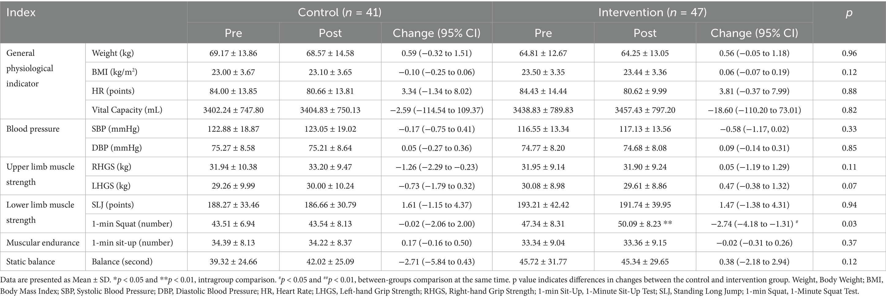 The between-group comparisons indicated that, following the 16-week Tai Chi intervention, participants in the intervention group exhibited a significant improvement in lower-limb muscle strength, as evidenced by a significant increase in the number of deep-squat repetitions completed in 1 min (p < 0.05).