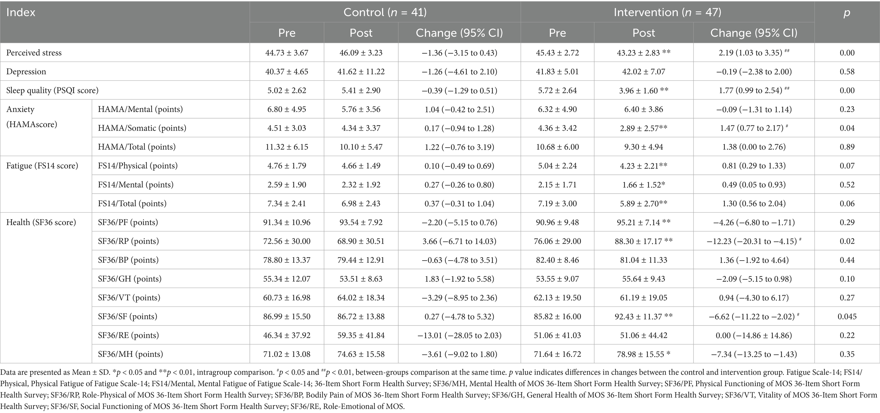 This study employed internationally recognized standardized instruments—the PSS (35), SDS (36), PSQI (37), HAMA (38), FS-14 (39), and SF-36 (40)—all of which have well-documented reliability, validity, and responsiveness. These measures have been repeatedly used as primary or key secondary endpoints in randomized controlled trials and large cohort studies published in high-impact journals (41–45), thereby ensuring the scientific rigor, methodological standardization, and cross-study comparability of our outcome assessments. The PSS is a well-established psychometric instrument designed to evaluate an individual’s subjective experience of stress (35). Scores between 38 and 56 are classified as indicative of high stress, with progressively higher scores reflecting more severe perceived stress levels (46). The SDS quantifies the presence and intensity of depressive symptomatology (36). Each item is rated on a 4-point scale (1 = none or a little of the time to 4 = most or all of the time), yielding a total score from 20 to 80, with higher scores indicating greater symptom severity (36). PSQI score is derived from the sum of seven component scores, yielding a total ranging from 0 to 21 (47). Lower scores reflect better sleep quality, while higher scores indicate poorer sleep. A score above 5 typically signifies significant sleep disturbances (48). The HAMA widely applied in clinical and research settings, assesses anxiety severity across both psychological and somatic domains (49). The instrument comprises 14 items graded from 0 to 4, where 0 denotes no anxiety and 4 indicates marked severity. The aggregate score ranges from 0 to 56, providing a quantitative index of anxiety burden. Conventional interpretive bands are: values >17 suggest mild anxiety; scores of 17–23 indicate moderate anxiety; and scores of 25–30 denote severe anxiety (50). The FS14 is a fatigue perception questionnaire that assesses two key dimensions: physical fatigue and psychological fatigue. The total score ranges from 0 to 33, with higher scores indicating greater fatigue severity (51). The SF-36 is a widely used instrument for assessing health-related quality of life, measuring self-reported physical and mental health across eight domains (52): physical functioning (PF), role limitations due to physical health (RP), bodily pain (BP), general health perceptions (GH), vitality (VT), social functioning (SF), role limitations due to emotional problems (RE), and mental health (MH). Additionally, this questionnaire was utilized to evaluate changes in perceived health status over the preceding year (53).