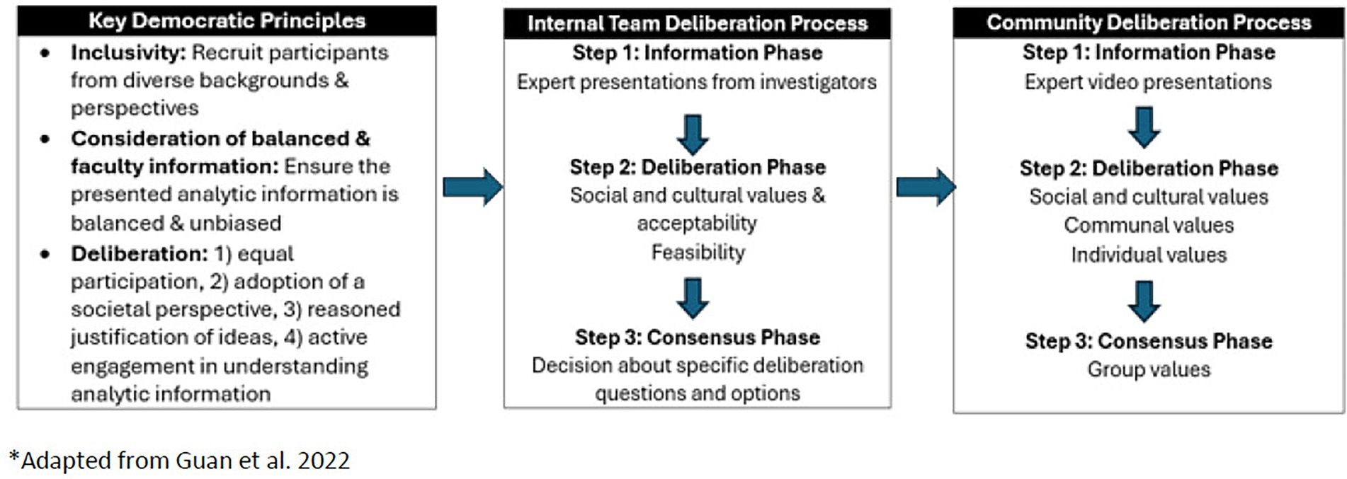 DD is generally conducted as a single deliberation conference that includes stakeholders and citizens representing multiple constituencies and perspectives. Because this activity was to be conducted by study collaborators encompassing a new collaboration with a large interdisciplinary and multi-cultural team who were unfamiliar with the DD methods, we elected to conduct an initial deliberation among the research team.