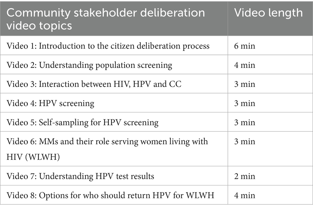 Our team identified key content that would enable a shared understanding of issues related to HPV screening that would enable community participants to deliberate on our questions. The objective was to be as parsimonious as possible in identifying content as the expert testimonies had to be relatively short, if we were to contain the process to a two-day deliberation. We generated a list of 8 topics we considered essential background information and developed draft slide decks for each topic; slide decks were reviewed by the full research team and finalized. Each slide deck was turned into a video recording with a voiceover recorded by a Nigerian voice actor in English, which was selected given that all of the deliberation participants were expected to have moderate to good verbal English fluency. Video topics are shown in Table 2. We also adapted in-depth workbooks from Guan et al.’s previous study (5) for the deliberators to use during the conference and a similar guide for deliberation facilitators to use during the conference. The workbooks were reviewed by Nigerian colleagues for cultural awareness and piloted with a group of three MMs who provided feedback and allowed us to revise them to be most useful and acceptable for the intervention.