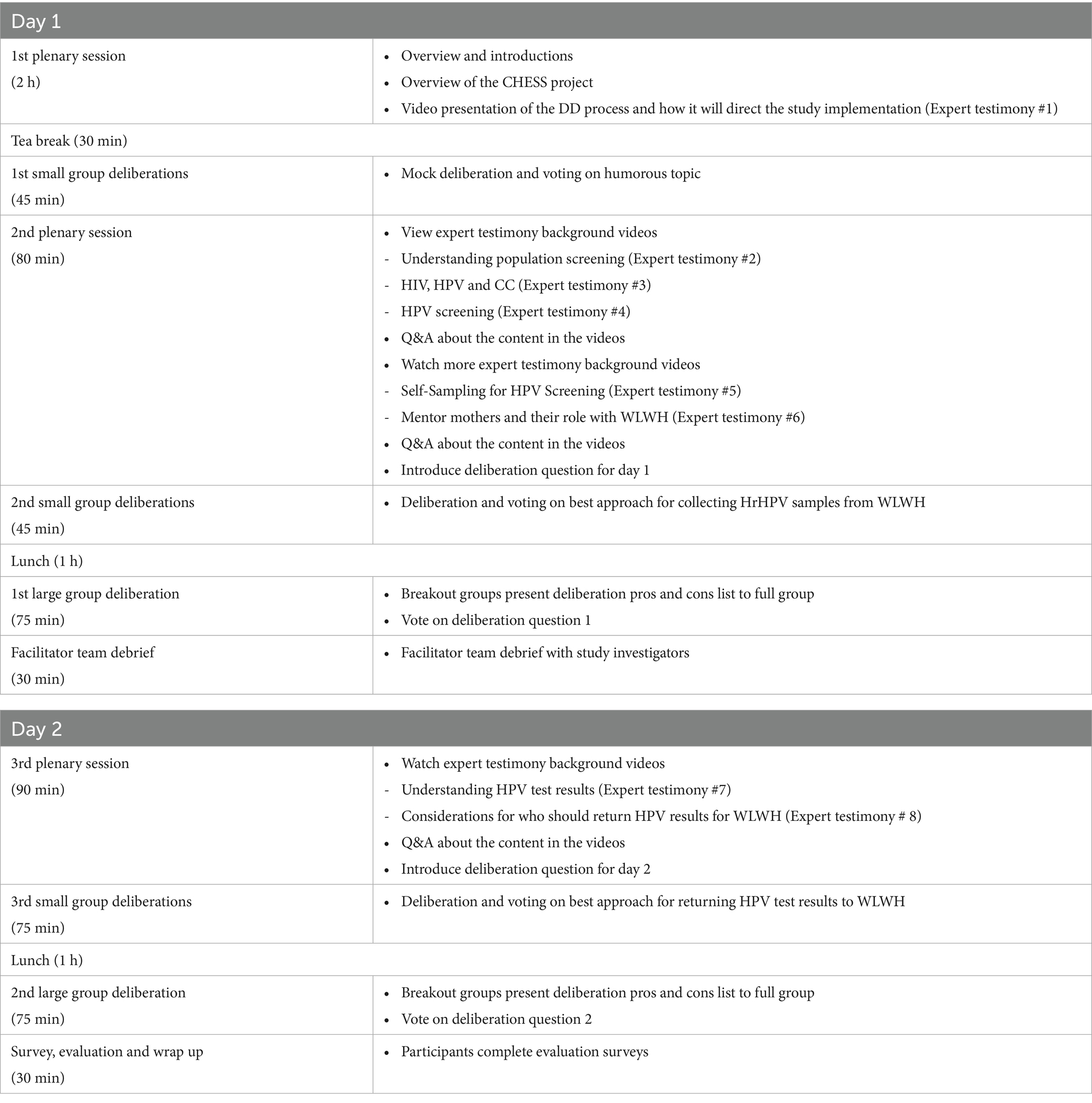 In the first 6 months of the funding period, the principal investigators and co-investigators on the project engaged in 24 h of online sessions that mimicked the planned deliberation process to be conducted with community constituencies. The research team deliberation was facilitated by a co-Investigator with expertise in DD (CM) and comprised eight investigators with expertise that included: DD methods, implementation science, CC prevention and treatment, and HIV/AIDS prevention and treatment. The research team deliberation was guided by the overarching question, what adaptations to the Mentor Mother program would be feasible and sustainable in the target settings that could be prioritized by recruited deliberators? We then decided on two more specific deliberation questions driven by areas for which our own research team was not in agreement: Question (1) What is the approach for collecting HPV samples for women who are HIV+ that best balances benefits and challenges? And Question (2) What is the approach for returning results to women who are screened for HPV that best balances the benefits and challenges?