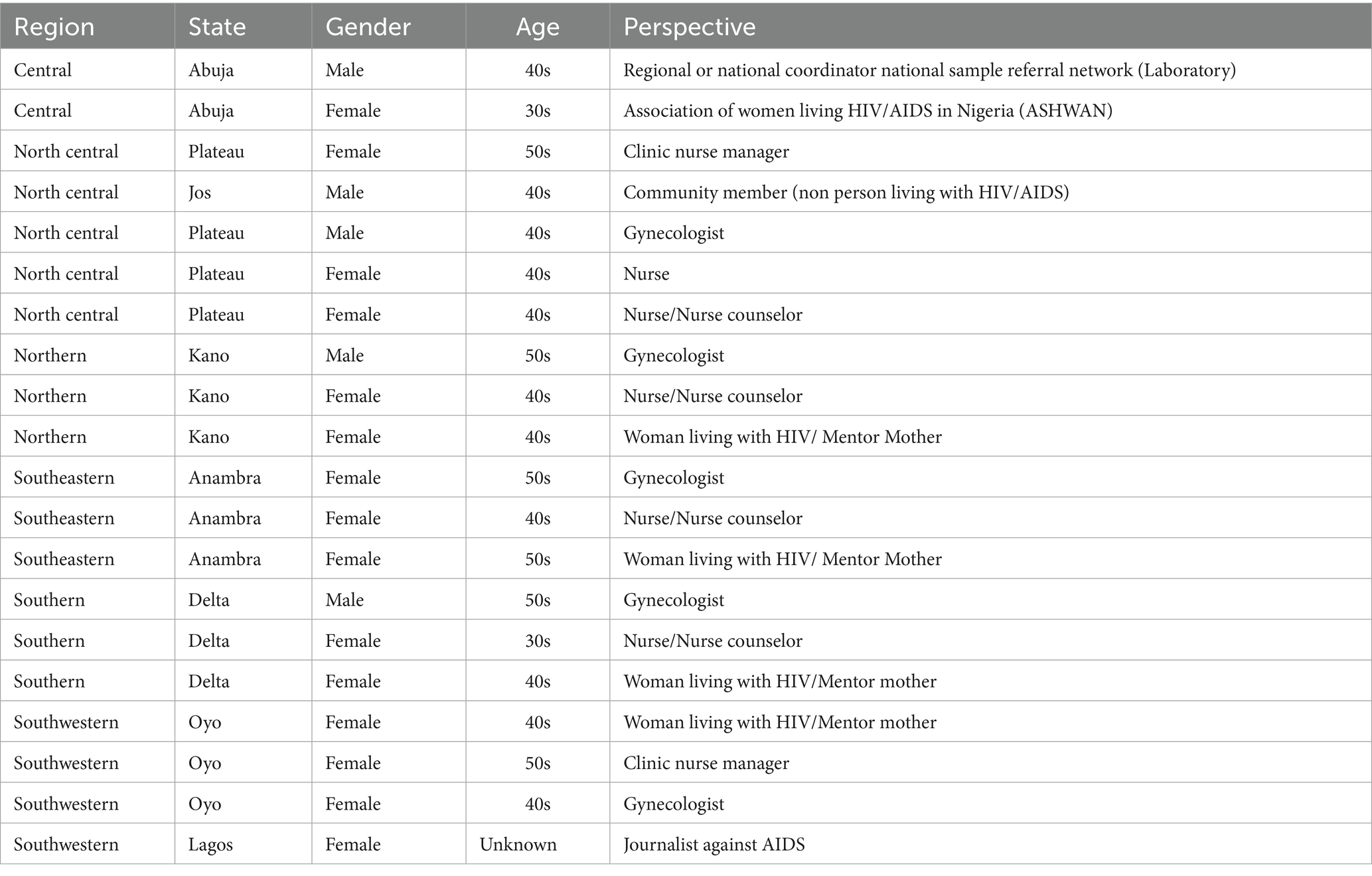 The research team developed a recruitment rubric intended to maximize the likelihood that a diverse group of stakeholders and members of the general public would be represented at the deliberation conference. Additionally, the team sought to include a diverse group of participants based on demographic factors including gender, age, and state (with a balance from the northern and southern regions of the country) (see Table 4 for diversity of actual deliberation participants). The research team developed a comprehensive list of potential deliberators that included representatives from NGOs associated with the MMs program, seasoned mentor mothers, WLWH, and nurses in community clinics. Community members not affected by HIV also were suggested as representatives of the general public. Ten key perspectives were identified as shown in Table 1.