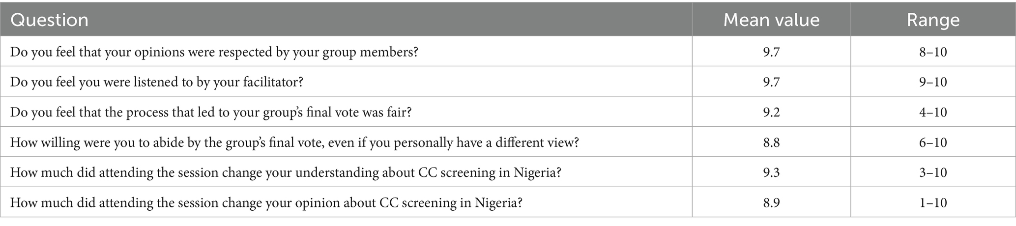 The same process of small group discussions followed by large group deliberation was repeated for day 2 of the conference. For day 2, the deliberation question was: What is the approach for returning results to women who are screened for HPV that best balances the benefits and challenges? Upon completion of day 2 deliberation activities, the participants took the post-survey. This study has been approved by the Institutional Review Boards of Emory University (STUDY00004817), APIN Public Health Initiatives, the Nigerian Institute of Medical Research, and the University of Ibadan. All study participants will be consented to participate.