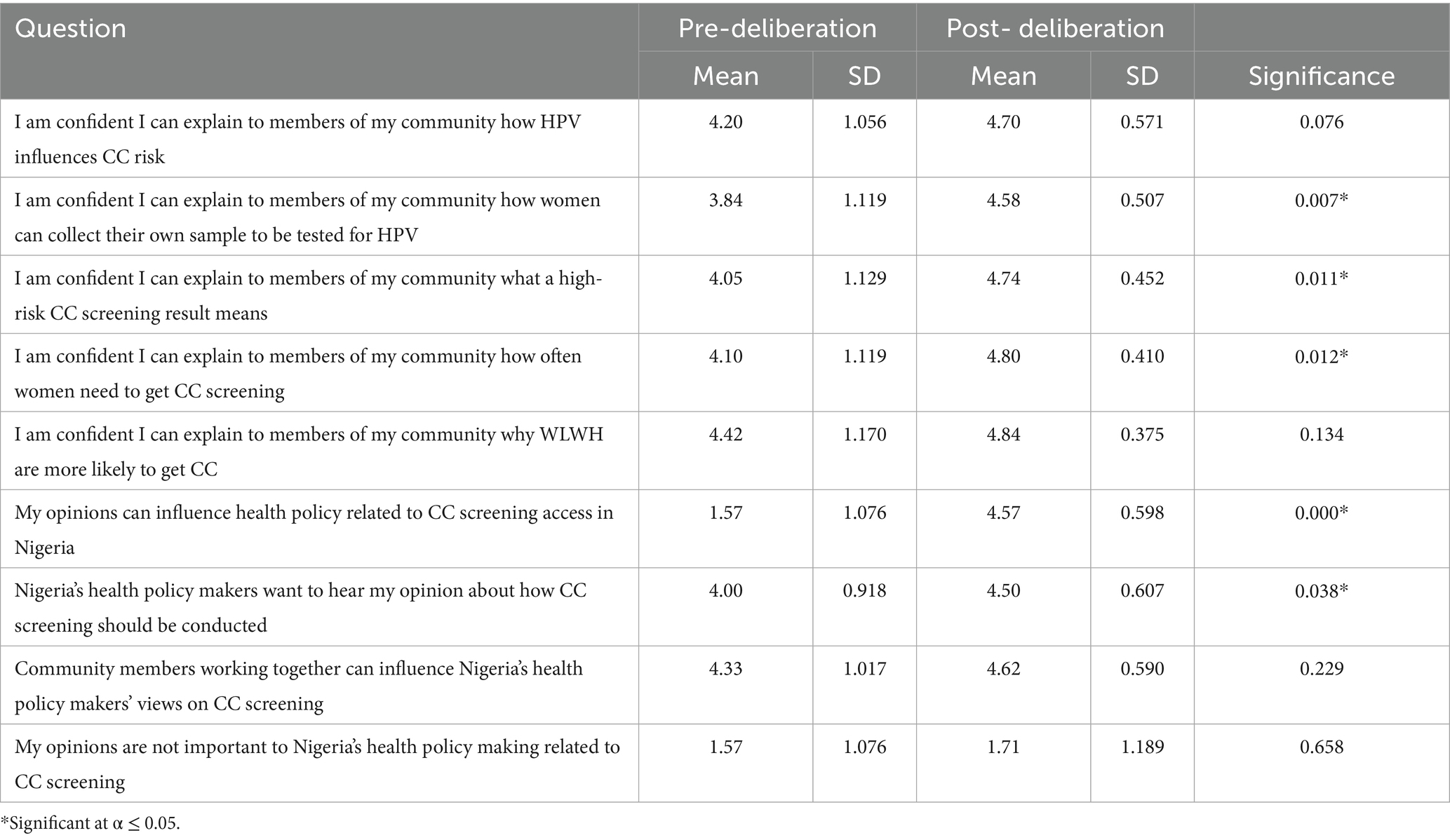 Table 6 shows pre- to post-deliberation changes in self-efficacy to explain to community members the concepts covered in the expert testimonies. Confidence (1-low to 5-high) to explain increased for all measures and this increase was statistically significant for 5 of the 9 measures. Increases were highest for deliberators with respect to explaining HPV self-testing to women with HIV, what a “high-risk” result means, and how often women need CC screening. Moreover, there were significant increases in indicators of feeling empowered by the process as indicated by increases in perceptions that “Nigeria’s health policy makers want to hear my opinion about how CC screening should be conducted.”