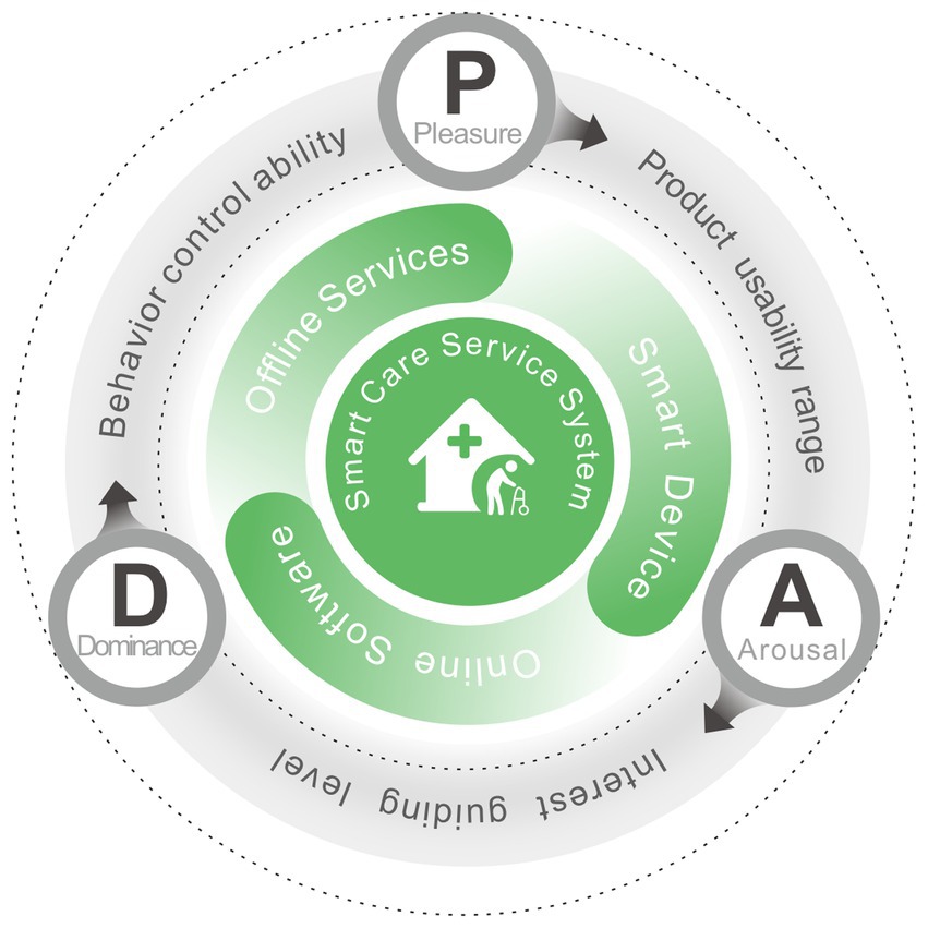 The emotional experiences of older adults, who are the target audience for the smart care service system, are able to naturally mirror this system’s current issues. The degree of pleasure can indicate how user-friendly and easy the system is to use. High levels of pleasure allow the user to think and make decisions with ease, choose the best method to finish the task, and have a positive experience. It is easier to focus and become drawn to the product and interest when the user is experiencing a specific level of arousal or excitement. However, prolonged and excessive arousal can lead to mental fatigue due to sustained high concentration. Dominance is a measure of how controllable a product or service is for the user, the more dominance there is, the lower the user’s mental effort and knowledge acquisition burden, and the more likely the user is to follow the system’s presetting to function correctly, i.e., the higher the degree of service completion (32). Therefore, the PAD emotion theory can obtain quantitative data of user’s emotional experience in this three aspects of the product usable range, interest guidance level, and behavioral control ability, respectively, which are highly consistent with the direction of the evaluation of the experience of the smart devices, online software, and offline services that make up the smart care service system. We use PAD emotional theory to describe the content of this system, forming a circular model as shown in Figure 1, this indicates that the PAD emotion theory can be employed for emotional experience evaluation of the smart care service system. Furthermore, in our study, we not only measured the emotional experiences of older adults, but also assessed their emotional needs.