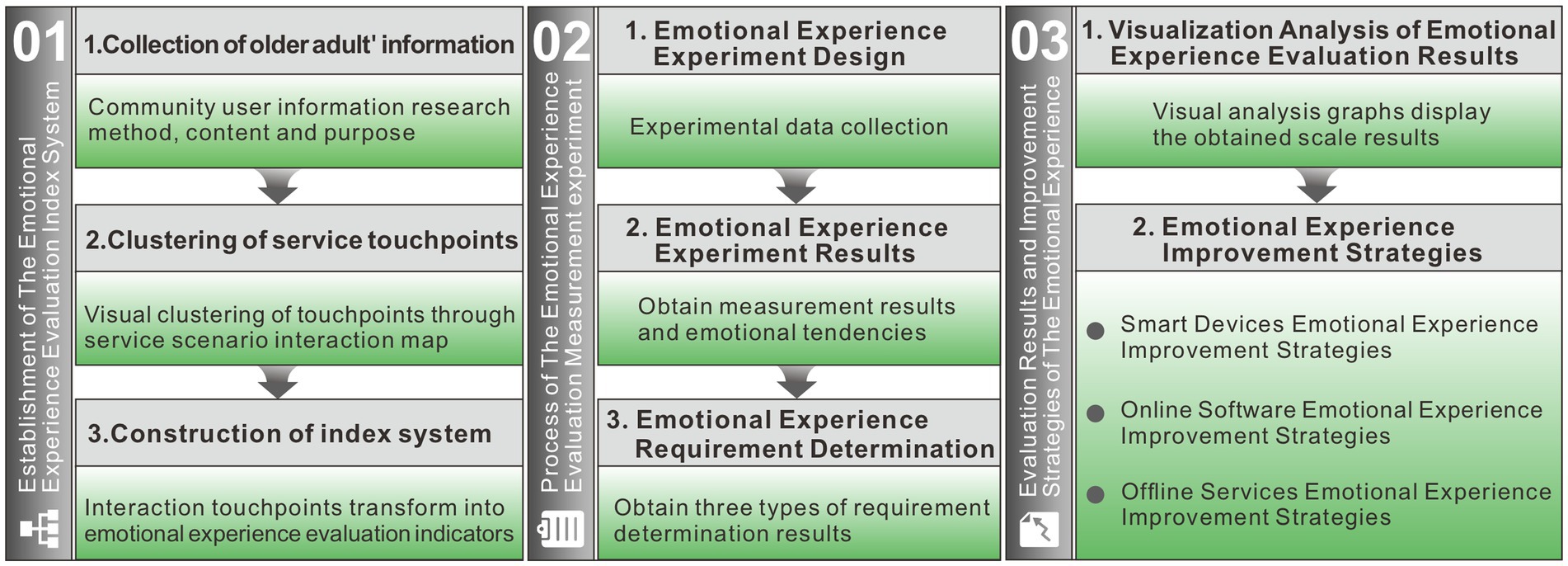 Methods: The study is informed by the Pleasure-Arousal-Dominance (PAD) emotion theory and guided by service design thinking. Qualitative research methods were employed to gather information about older adults within the target community. By mapping service scenario interaction touchpoints, the research team deconstructed, clustered, and transformed the system service touchpoints. Evaluation indicators were set from three aspects: smart devices, online software, and offline services, to construct an emotional experience evaluation system. Using quantitative research methods, with user emotional valence as the variable, the study conducted measurement experiments on the emotional experience evaluation of older users, obtaining measurement results from two dimensions: emotional experience tendencies and emotional requirement assessment.