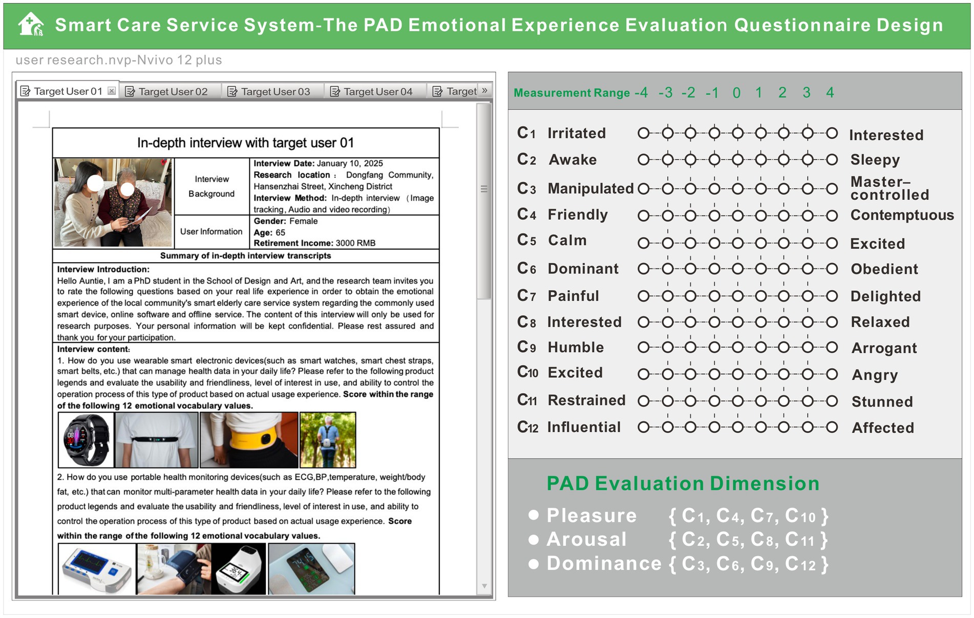 Specific questionnaire content was designed for the emotional experience evaluation index system of the smart care service system and combined with PAD emotion scale. To fit the emotional characteristics of Chinese people, the Institute of Psychology of the Chinese Academy of Sciences formulated the Chinese version of the PAD standardized scale as a user-multidimensional emotion measurement tool based on a multidimensional emotional space model, which adopts a nine-point scoring mechanism and is arranged in a bipolar manner according to ±4. Under each emotional dimension, four pairs of adjective groups can reflect the human body’s emotional response and have opposite semantic meanings, emphasize the degree of emotional contrast to help users choose their preferences. Each set of emotional semantics is generated by experts and serves as a fixed reference phrase. An example of the design of the questionnaire and task scale is shown in Figure 4. Pleasure includes C1, C4, C7, C10; arousal includes C2, C5, C8, C11; dominance includes C3, C6, C9, C12, and the scoring level is directly proportional to the emotional validity. The left side of the figure shows a thumbnail example of the questionnaire processor, while the right side shows the form used to score evaluation indicators during the survey process. During the experiment, the research team first asked about the basic usage of 18 survey indicators according to the questionnaire content, and then asked older users to score 12 emotional comparison phrases based on their overall usage experience. The acquired user interview results were further transformed into textual information imported into the qualitative analysis software Nvivo12.0, and the scoring results were analyzed by SPSS software.