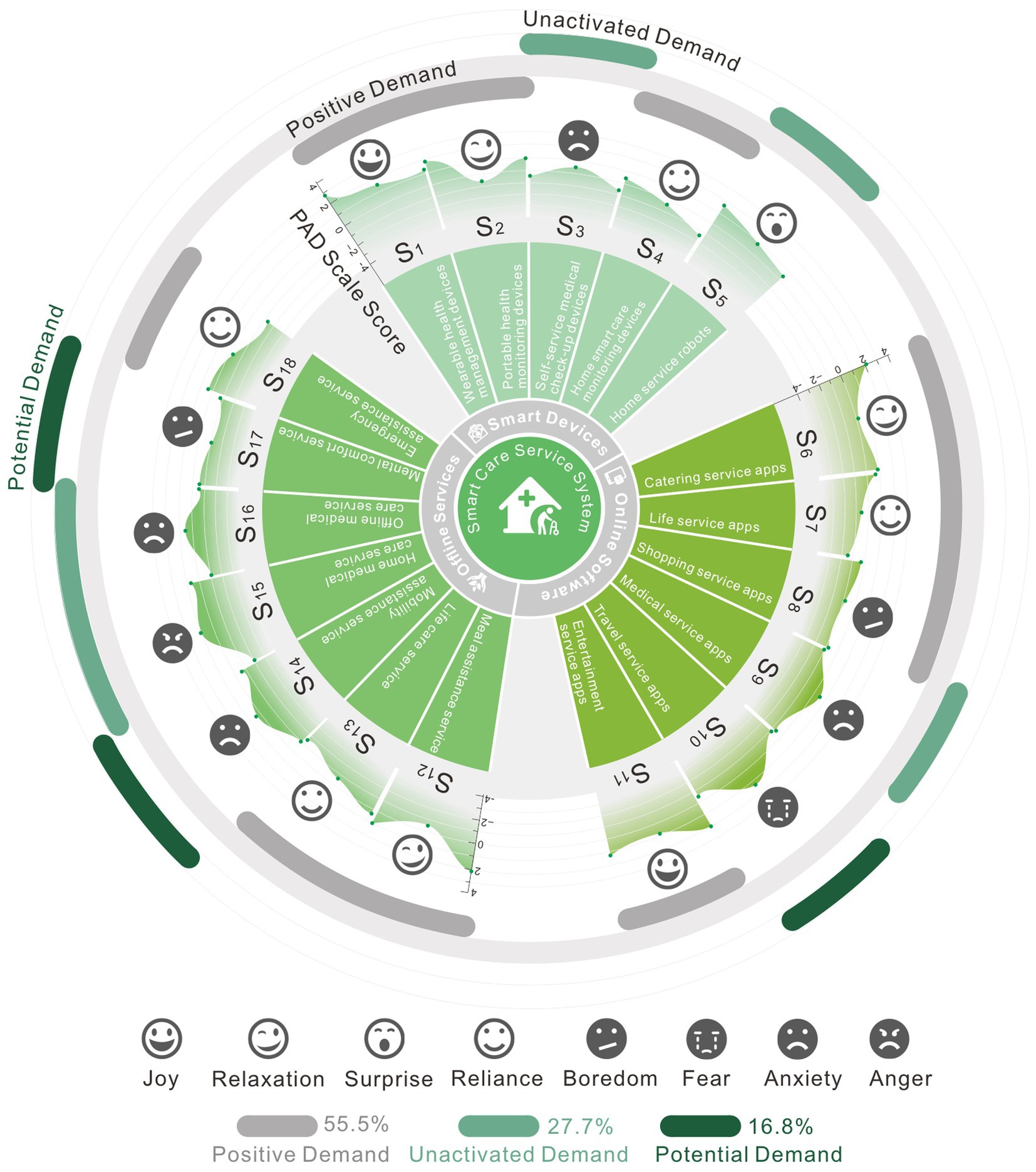 According to the visualization results, a flat graph structure typically results in happy experiences, whereas the touchpoint behavior that creates negative experiences has a convex structure on the PAD quantification graph. A considerable percentage of negative feelings are experienced by older consumers when interacting with offline services and online applications. From the current emotional needs assessment results, positive demand accounts for the largest proportion, with 55.5%, unactivated demand accounts for 27.7%, and potential demand accounts for approximately 16.8%.