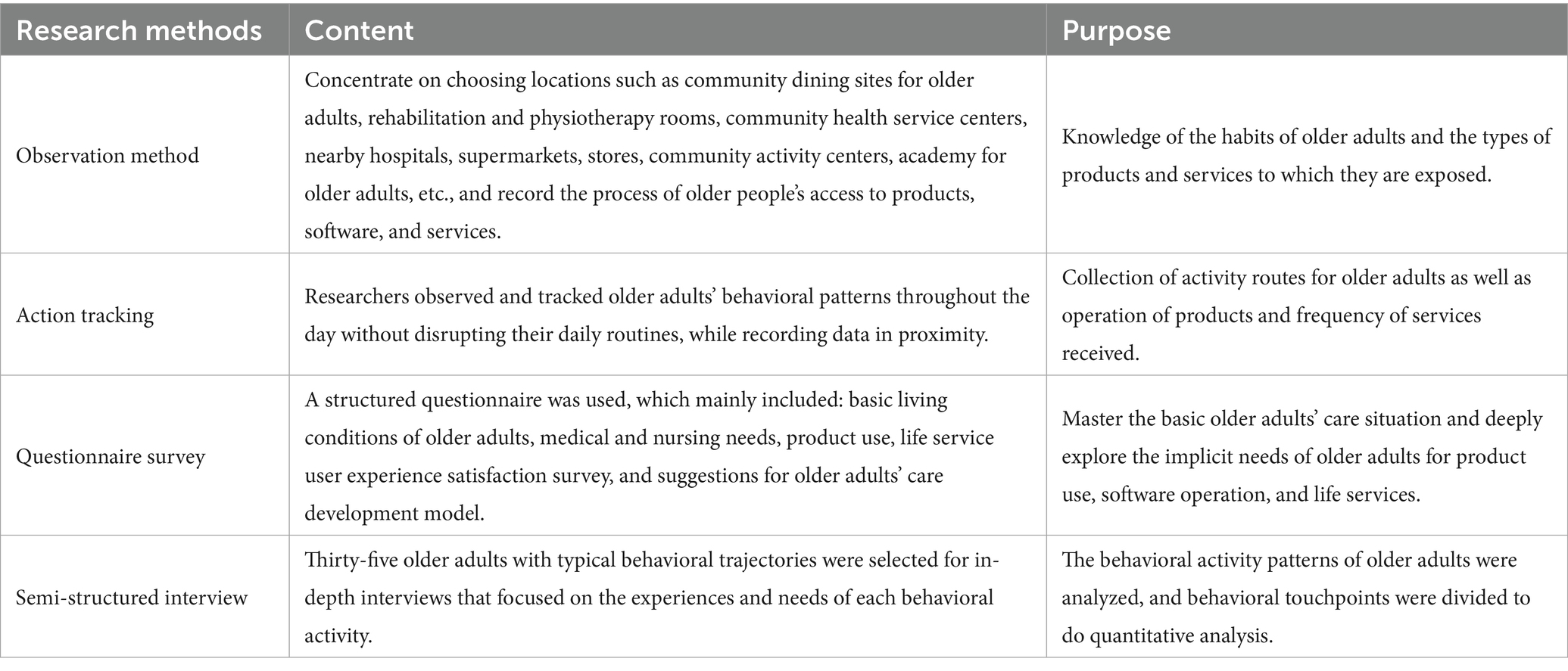 Basic data about the community’s older adults, their lifestyle choices, and a survey asking about their satisfaction with the software, product, and life service make up the majority of the research content. Observation, action tracking, questionnaire research, semi-structured interviews, and other techniques are all part of the participatory research approach. The purpose is to explore the existing problems of the smart care service system through the tracking process of some behavioral contacts, processes, and experiences of older adults’ life trajectory, to assemble, screen, and quantify the service contacts of behaviors, and to further put forward the service design strategies, and the specific research methodology, content, and purpose are shown in Table 1.