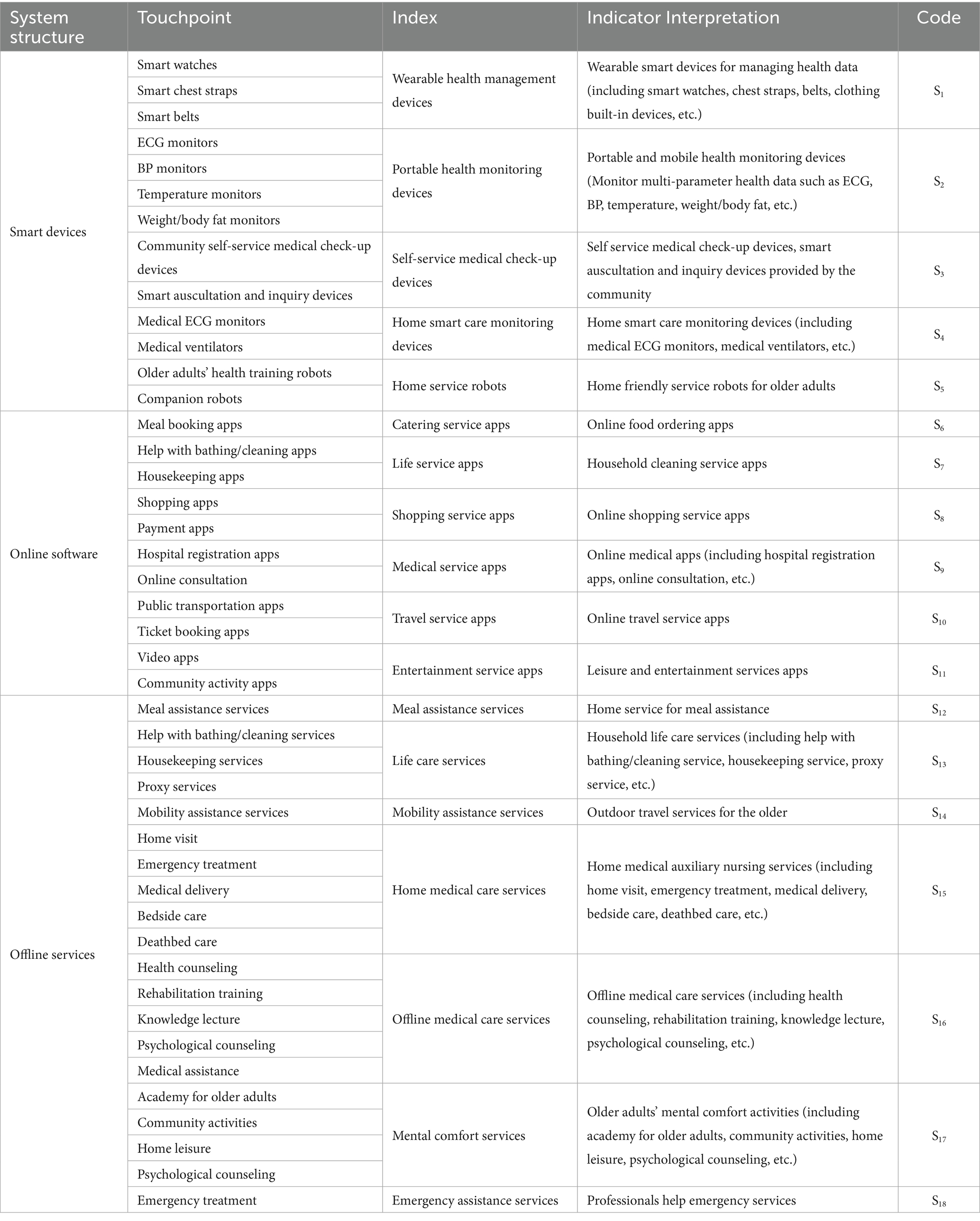 The research team conducted a qualitative study on the high-frequency interactive service touchpoints obtained through expert guidance and group discussions and merged analogous interaction points into emotional experience evaluation indicators. In terms of smart devices used by older adults, devices of the same category are grouped together and receive five emotional experience evaluation indicators, namely wearable health management devices, portable health monitoring devices, self-service medical check-up devices, home smart care monitoring devices, home service robots. In terms of the use of online software by older adults, online software with the same functions is classified into one category, and six emotional experience evaluation indicators are obtained. The functional categories include catering service apps, life service apps, shopping service apps, medical service apps, travel service apps, entertainment service apps. In terms of older adults enjoying offline services, those with the same service direction are classified into one category and receive seven emotional experience evaluation indicators, including meal assistance services, life care services, mobility assistance services, home medical care services, offline medical care services, mental comfort services, emergency assistance services.