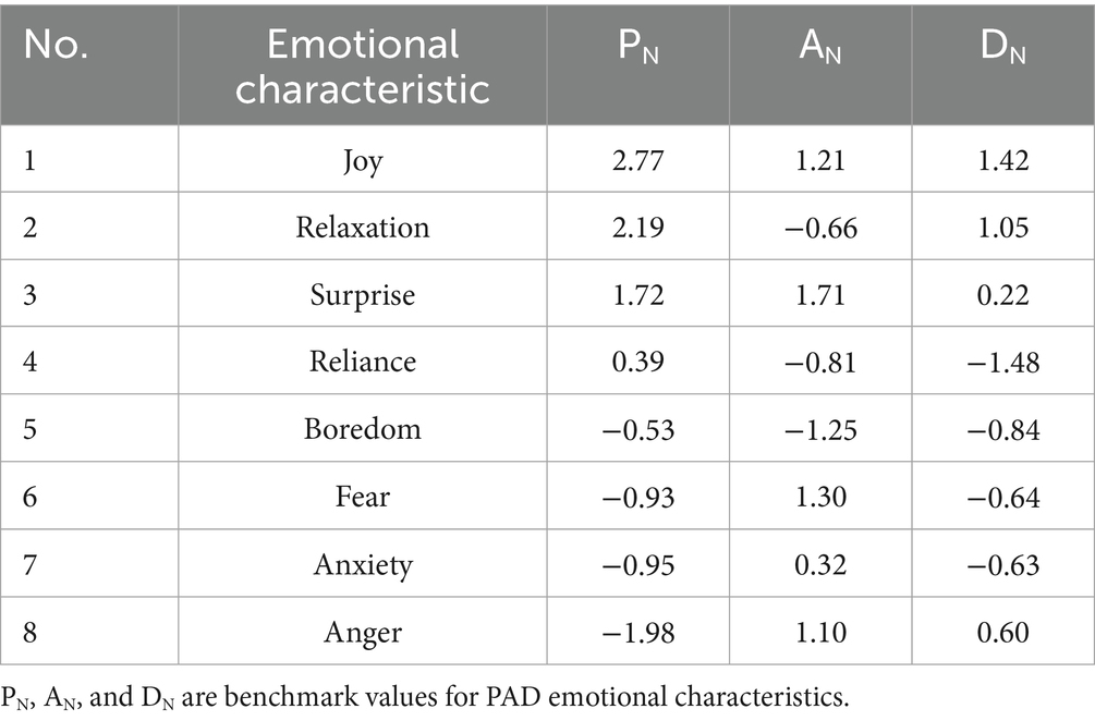 The PAD emotional theory, proposed by Mehrabian and Russell in 1974, is a multidimensional model for measuring emotions. It posits that human emotional experiences are not a unitary physiological manifestation, but rather a complex and multifaceted phenomenon (30). This model classifies human emotions into three fundamental dimensions: pleasure, arousal, and dominance. Pleasure (P) reflects an individual’s positive or negative affective response to information. Arousal (A) corresponds to the intensity of physiological activation elicited by external stimuli. Dominance (D) describes the perceived level of control over the information or situation. The PAD emotion theory is an emotional measurement method based on psychological responses. It has strong operability in emotional computing, which stems from the spatial nature of the theoretical model. By quantifying and establishing the positioning and relationships of several emotional categories in the emotional space, it can calculate the difference between user experience emotions and basic emotional values, thereby determining emotional tendencies. Current research primarily focuses on the user emotional experience measurement stage. Huang et al. (31) explored seven main “acoustic features” and their differences in physical features related to gender identification and manifestation of affective states in the PAD emotion model during speech interaction. Zhao et al. (32) combined the proposed emotion model with the Pleasure-Arousal-Dominance (PAD) emotion model and the Five Factor Model (FFM) to evaluate user emotions of three information system features (user interface, interaction quality, and service environment) in mobile libraries. Xu et al. (33) applied the PAD emotion theory to explore the impact of online comment emotions on perceived comment usefulness built upon these three basic emotional dimensions.