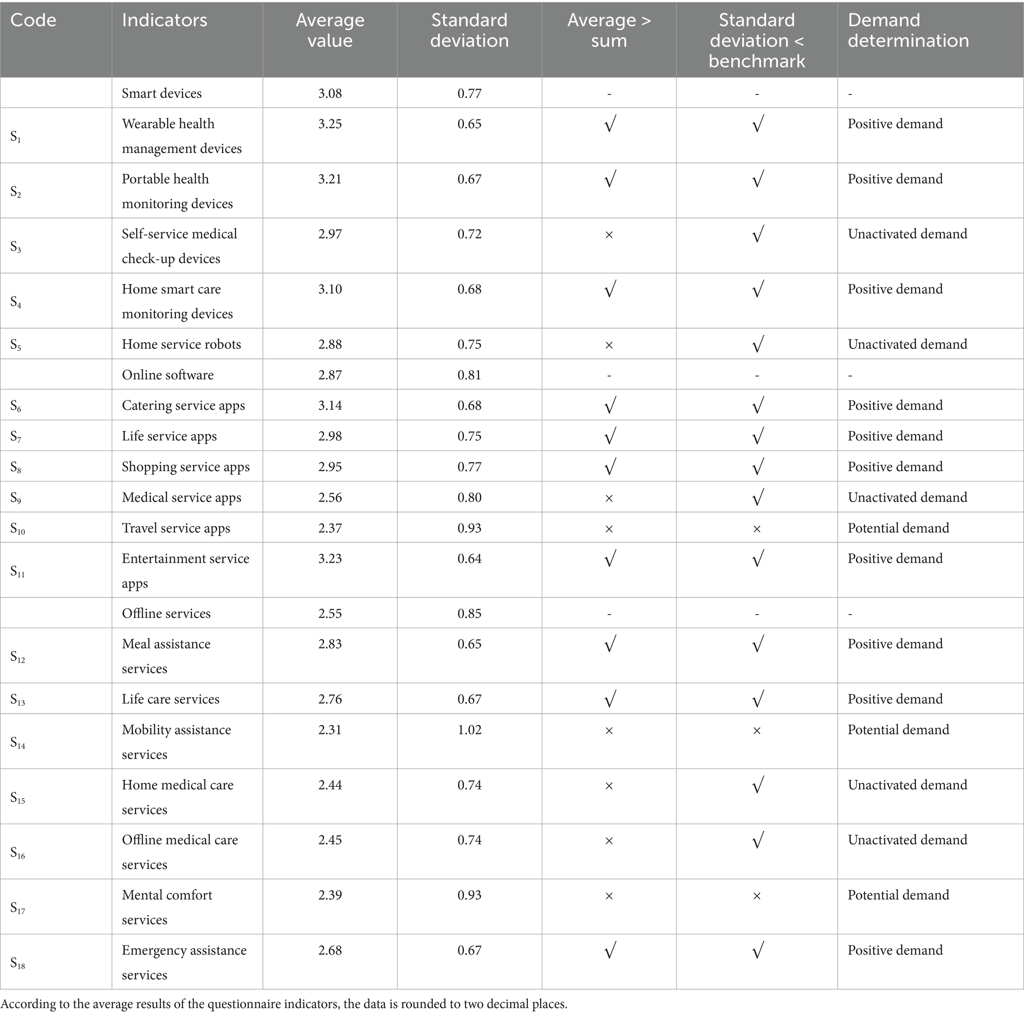 Finally, calculate the average score and standard deviation of each indicator. If the average score of the indicator is greater than the benchmark average score and the standard deviation is less than the benchmark standard deviation, it can be determined as a positive demand if the older respondents understand the content and express positive feedback clearly. The demand point where the average score of the indicator is less than the benchmark average score and the standard deviation is also less than the benchmark standard deviation is that the older respondents clearly use the content but do not necessarily express positive feedback, which can be judged as unactivated demand. The demand point where the average score of the indicator is greater than the benchmark average score and the standard deviation is greater than the benchmark standard deviation is that older users are unable to operate the indicator content and express negative feedback, which can be judged as potential demand.