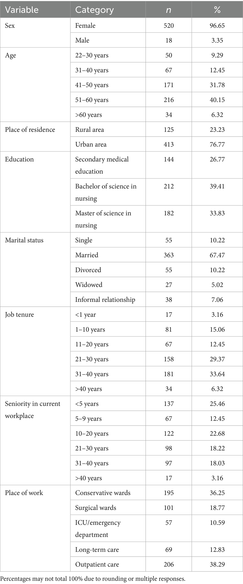 Most participants lived in urban areas (76.77%, n = 413), while 23.23% (n = 125) resided in rural areas. In terms of education, the most frequent qualification was a bachelor’s degree in nursing (39.41%, n = 212), followed by a master’s degree (33.83%, n = 182) and secondary medical education (26.77%, n = 144). Regarding marital status, most respondents were married (67.47%, n = 363). Others were single (10.22%), divorced (10.22%), widowed (5.02%), or in informal relationships (7.06%). In terms of work experience, the most common ranges were 31–40 years (33.64%, n = 181) and 21–30 years (29.37%, n = 158). A small proportion (3.16%) reported less than one year of total work experience. At their current workplace, most participants had worked for less than 5 years (25.46%), followed by 10–20 years (22.68%) and 5–9 years (12.45%). A minority (3.16%) had been employed at the same institution for over 40 years.