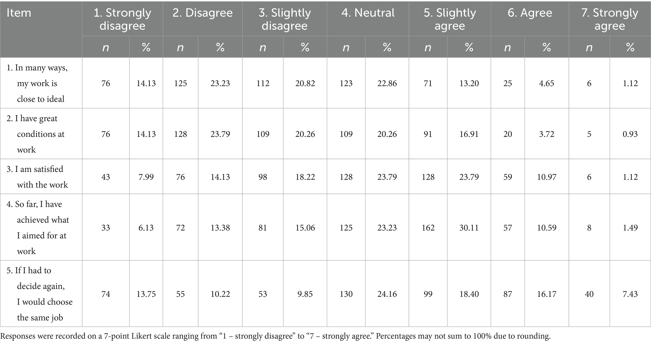 Job Satisfaction Scale (SSP). This instrument evaluates the cognitive aspect of general job satisfaction and includes five items rated on a 7-point Likert scale (1 = strongly disagree to 7 = strongly agree). A higher score indicates greater job satisfaction. In this study, Cronbach’s alpha was 0.89, consistent with the original validation (53).