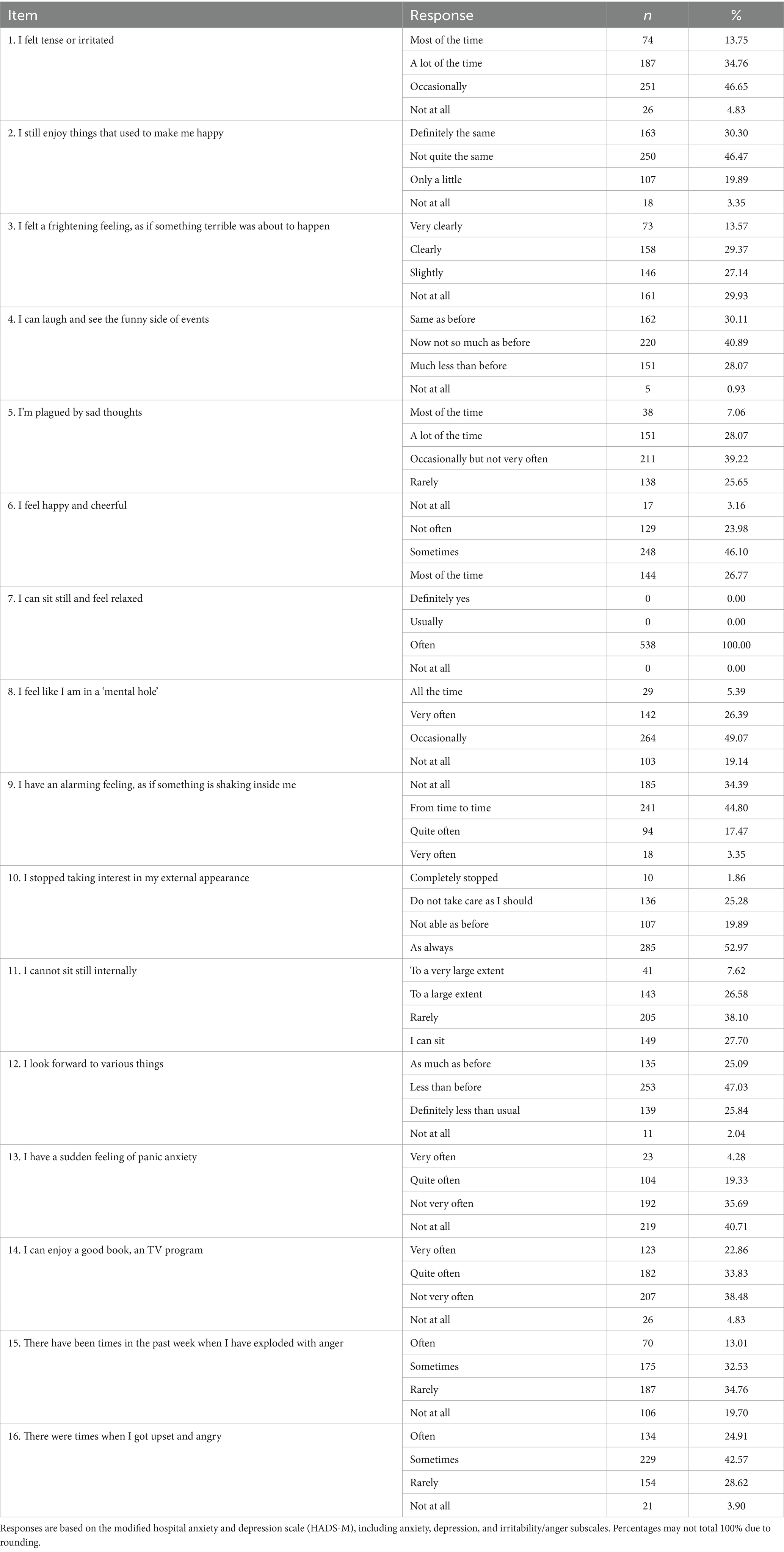 It is also important to distinguish between mood-related phenomena (such as symptoms of anxiety and depression), which are generally more enduring and pervasive, and emotions like anger, which are typically shorter in duration and arise in response to specific stimuli (10). This distinction underscores the complex and multidimensional nature of psychological functioning considered in the present research. For clarity, in this manuscript we treat anxiety and depressive symptoms as mood phenomena (longer-lasting, pervasive), whereas anger is treated as an emotion (short-lived, stimulus-bound); we assess anger symptoms using the HADS-M anger subscale and do not assess aggressive behavior. Throughout this manuscript, the term “depression” refers exclusively to “symptoms of depression” as measured by the HADS-M; we do not infer clinical diagnoses.