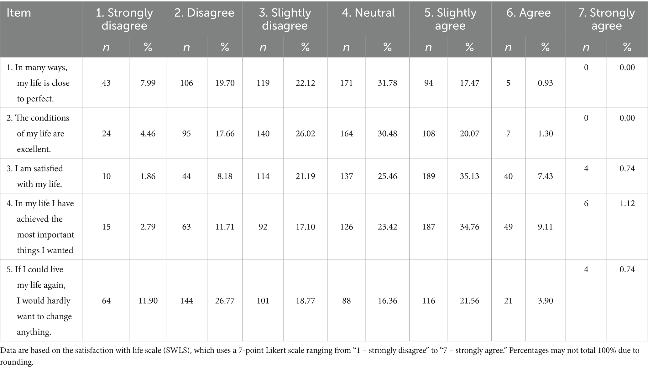 For the Satisfaction with Life Scale (SWLS), most respondents selected neutral answers to the statements “My life is close to ideal” (31.78%) and “The conditions of my life are excellent” (30.48%). Detailed results are presented in Table 6.