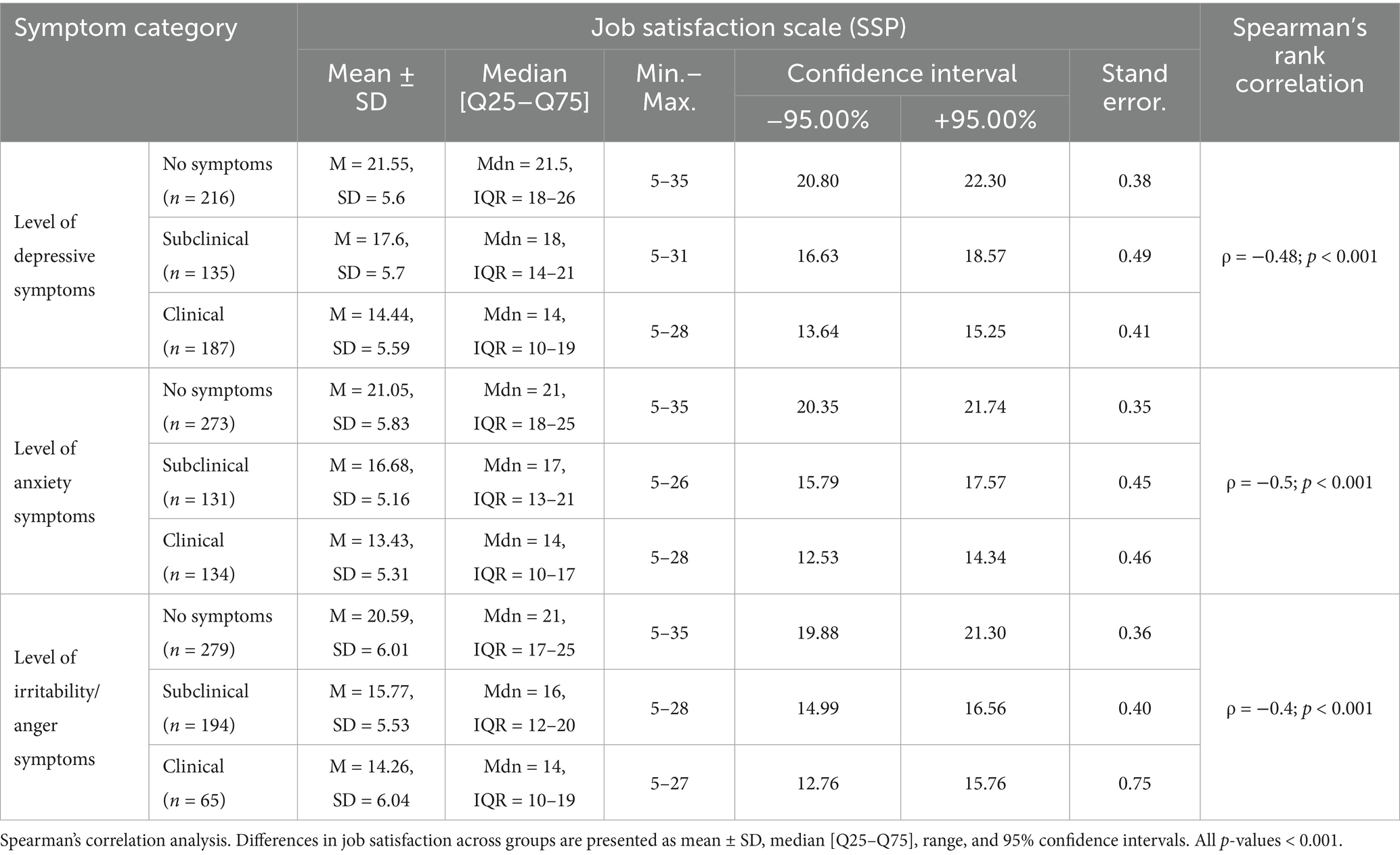 Table 5. Relationship between levels of depression, anxiety and irritability/anger symptoms and job satisfaction (n = 538).