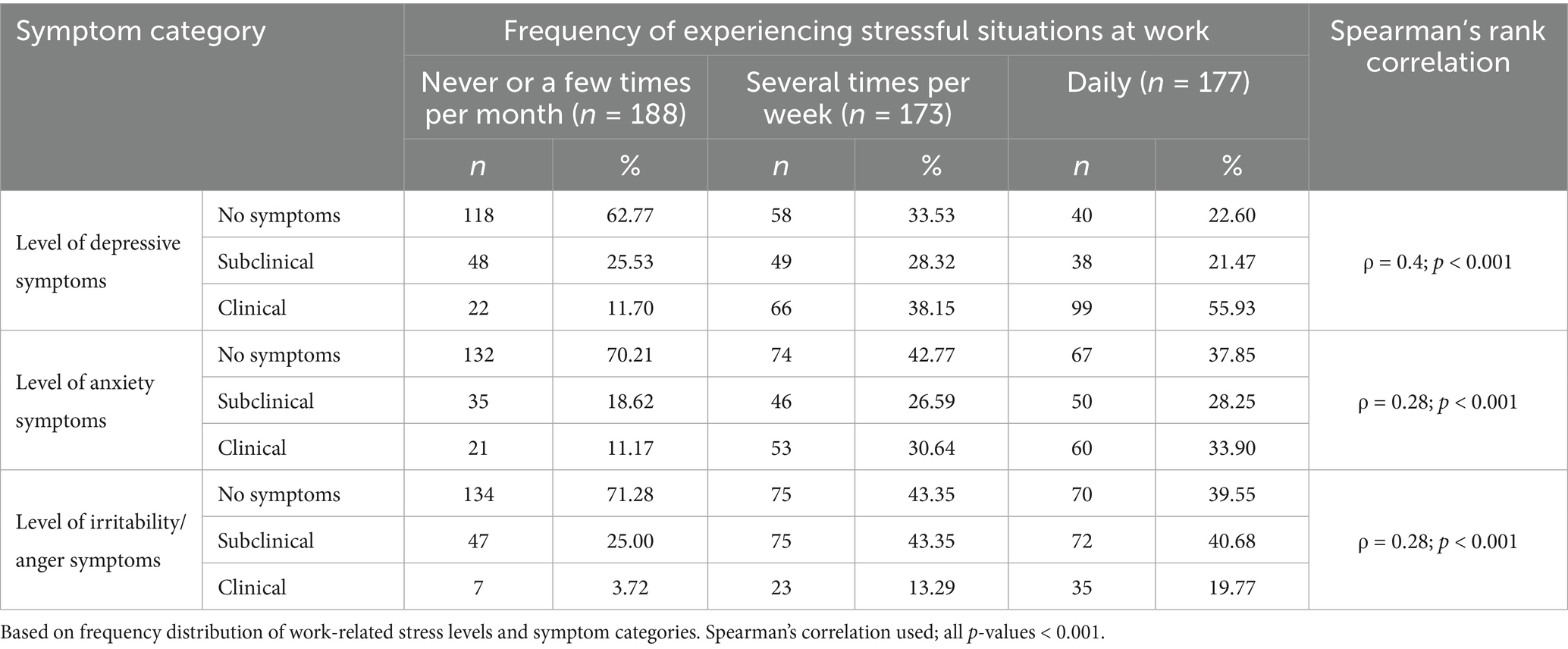 Table 6. Relationship between frequency of experiencing work-related stress and levels of depression, anxiety and irritability/anger symptoms (n = 538).
