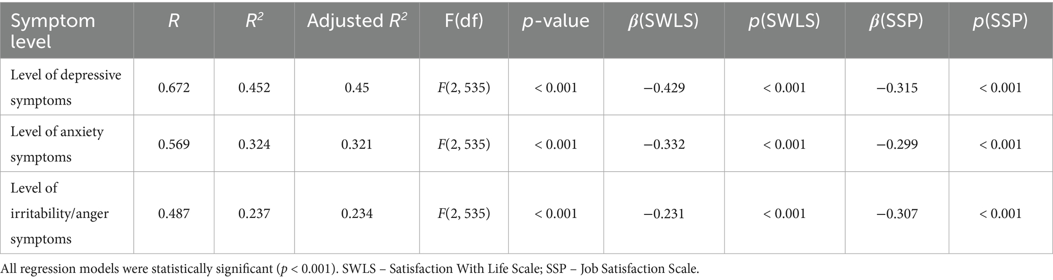 Results: A high prevalence of psychological symptoms was observed. All symptom domains were significantly and negatively correlated with life and job satisfaction (p < 0.001). Multiple regression analyses indicated that depressive symptoms were the strongest predictors of both life satisfaction (β = −0.429) and job satisfaction (β = −0.315), followed by irritability/anger symptoms. All models were statistically significant (p < 0.001).