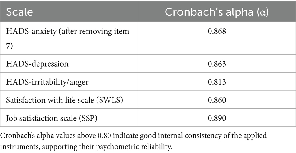 Internal consistency of the applied scales was assessed using Cronbach’s alpha. The HADS subscales yielded the following values: HADS-Anxiety (α = 0.868; after removing item 7), HADS-Depression (α = 0.863), and HADS-Anger subscale (α = 0.813). The Satisfaction with Life Scale (SWLS) reached α = 0.86, and the Job Satisfaction Scale (SSP) α = 0.89. These values indicate high psychometric reliability. Reliability coefficients are presented in Table 9.