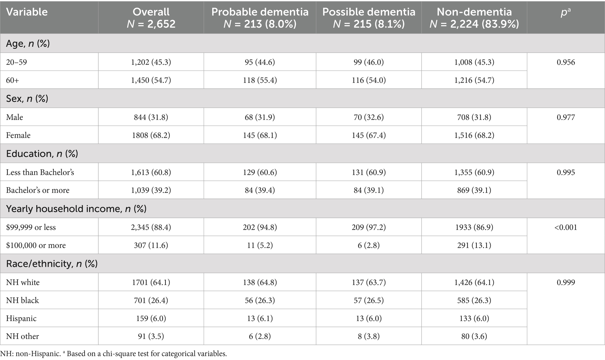 Characteristics of the sample, overall and by dementia status