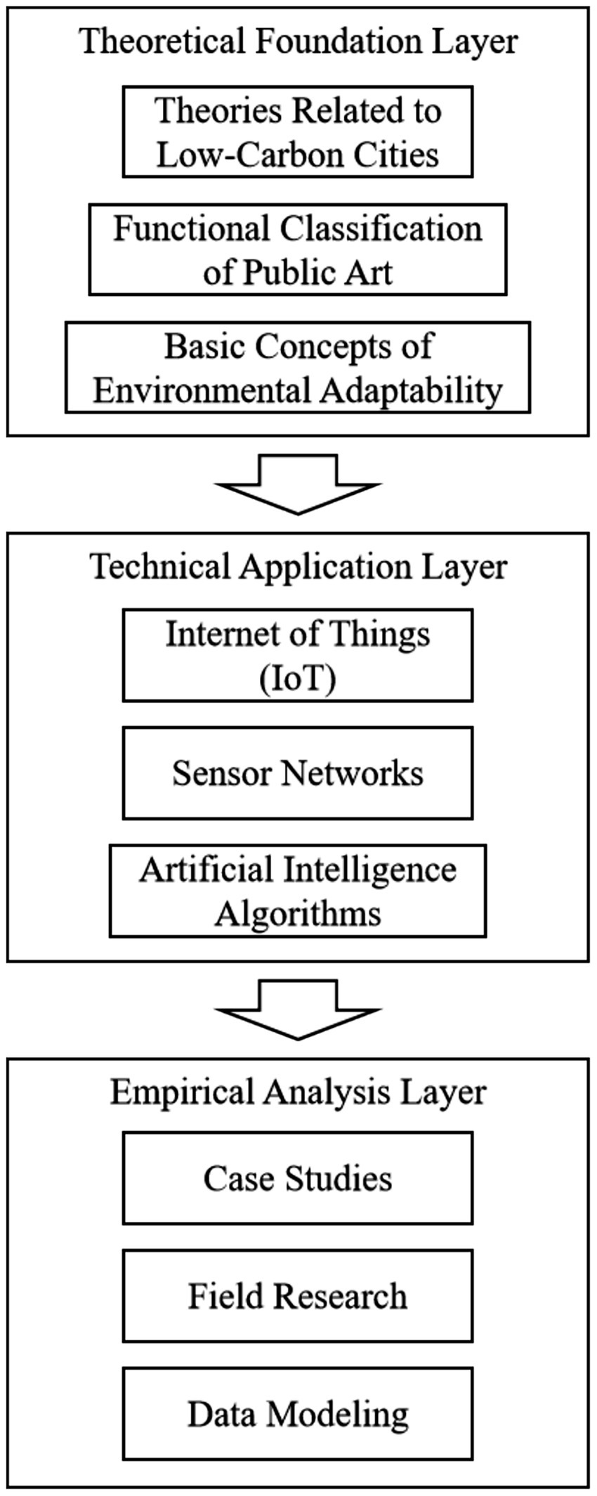 Theoretical foundation layer: including the related theories of low-carbon cities, the functional classification of public art installations, and the basic concepts of environmental adaptability.