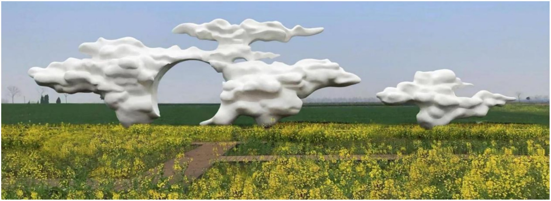 Figure 5 shows the relationship between user experience and comprehensive score. With the satisfaction score increased from 3 to 5, the comprehensive score increased by 12.3 points on average (p < 0.05), indicating that user participation has a significant regulatory effect on the low-carbon effect. Some devices interact with the natural environment through dynamic design (cloud sculpture as shown in Figure 6), attracting the audience to take photos and interact, thus improving the satisfaction and overall low-carbon effect.