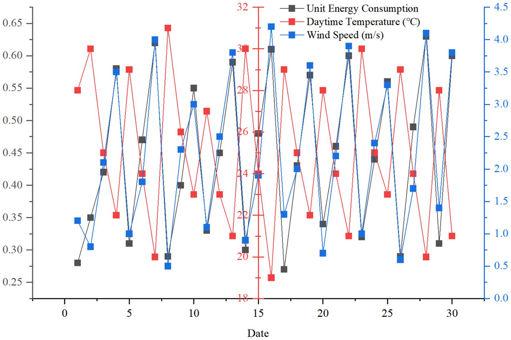Figure 9 shows the change of unit energy consumption of case C under different weather conditions for 30 consecutive days. The unit energy consumption is the lowest in sunny days and the highest in rainy days. This verifies the dynamic adaptability of intelligent design to environmental changes.
