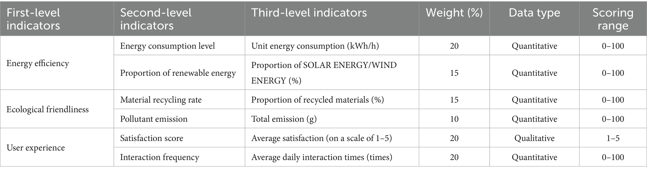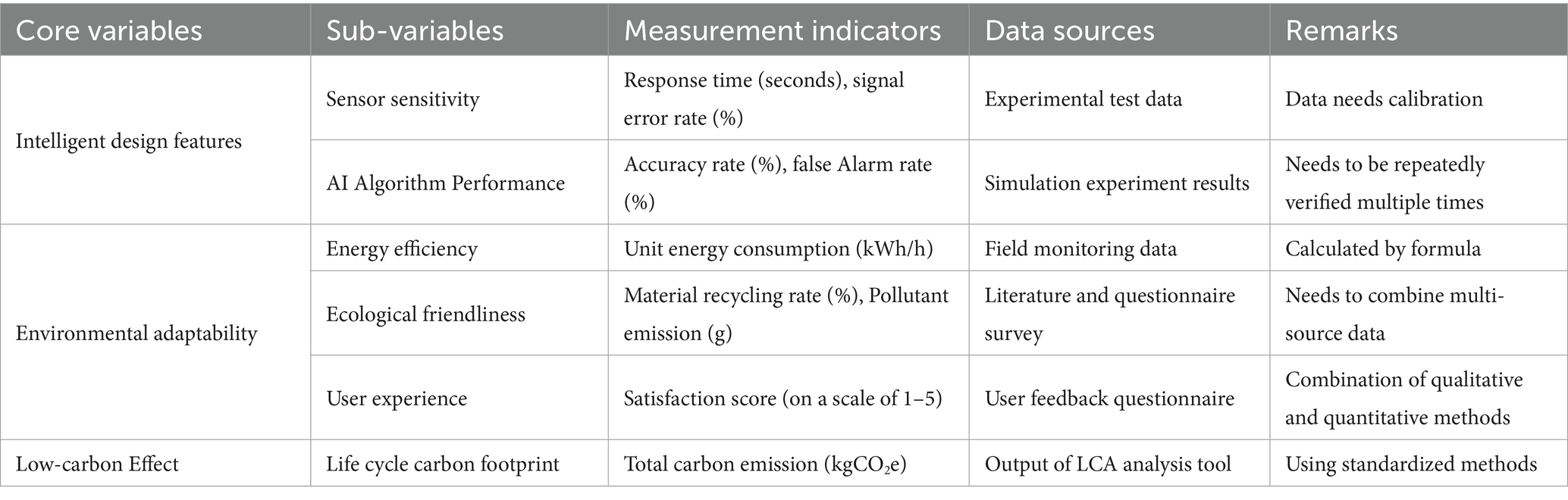 In the research and design process, it is very important to define the core variables and their measurement standards (33). The core variables of this study mainly include the following aspects: one is the intelligent design characteristics, which refers to the performance of public art installations when applying intelligent technology. The second is environmental adaptability, that is, the performance of the device under various natural conditions. It covers many dimensions such as energy efficiency, eco-friendliness and user experience. The third is the low-carbon effect, which represents the contribution of the device to carbon emissions in the whole life cycle. Table 1 shows the relationship between these variables and their measurement indicators more intuitively.