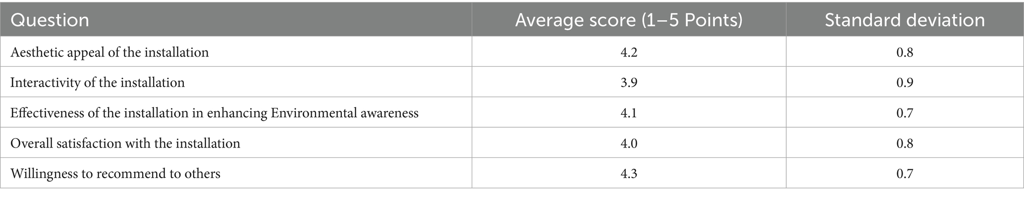Table 2 summarizes the statistics of the results of the user feedback questionnaire, and shows the respondents’ evaluation of the aesthetic degree, interactivity, environmental awareness improvement effect and overall satisfaction of public art installations. These data help to understand the actual experience and needs of users.