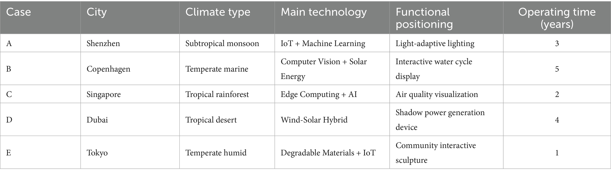 In order to ensure the relevance and universality of the research results, this study is based on technical representativeness (at least two intelligent technologies such as Internet of Things, artificial intelligence and edge computing are integrated in each case), environmental diversity (the cases cover different climatic regions such as subtropical zone, temperate zone, tropical rain forest and desert), functional relevance (the selected devices serve unique environmental or social functions such as lighting, water circulation, air quality visualization and community interaction) and data availability (comprehensive operational data and data can be obtained in each case). These standards can ensure that the case study covers a wide range of design strategies and environmental conditions, and then support the research goal of exploring the environmental adaptability of intelligent public art installations. Edge computing is a distributed computing mode, which processes data near sources (such as sensors), reduces delay and improves real-time response ability. The basic situation of the case is shown in Table 4.