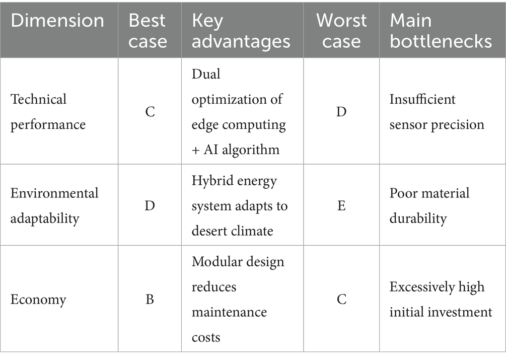 Through horizontal comparison (Table 5), it is found that technical maturity is positively related to environmental adaptability, but high complexity design may increase maintenance costs. For example, although case C has the best performance, the procurement cost of its edge computing module is 35% higher than that of the traditional scheme; In case E, due to the use of degradable materials, the recovery rate is as high as 92% (Table 6), but the lack of durability leads to high maintenance frequency.
