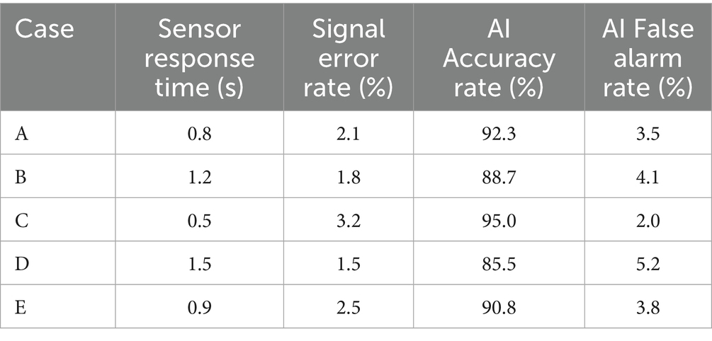 As can be seen from Table 5, the sensor response time of case C is the shortest, only 0.5 s, but its signal error rate is relatively high, reaching 3.2%. This means that there is a trade-off between sensitivity and stability. At the level of AI algorithm, the accuracy of case C reached the highest 95.0%, and the false positive rate was the lowest, only 2.0%. It can be seen that the algorithm optimization has achieved remarkable results. In contrast, the false positive rate of AI in case D is as high as 5.2%. This may be because its training data is not enough.