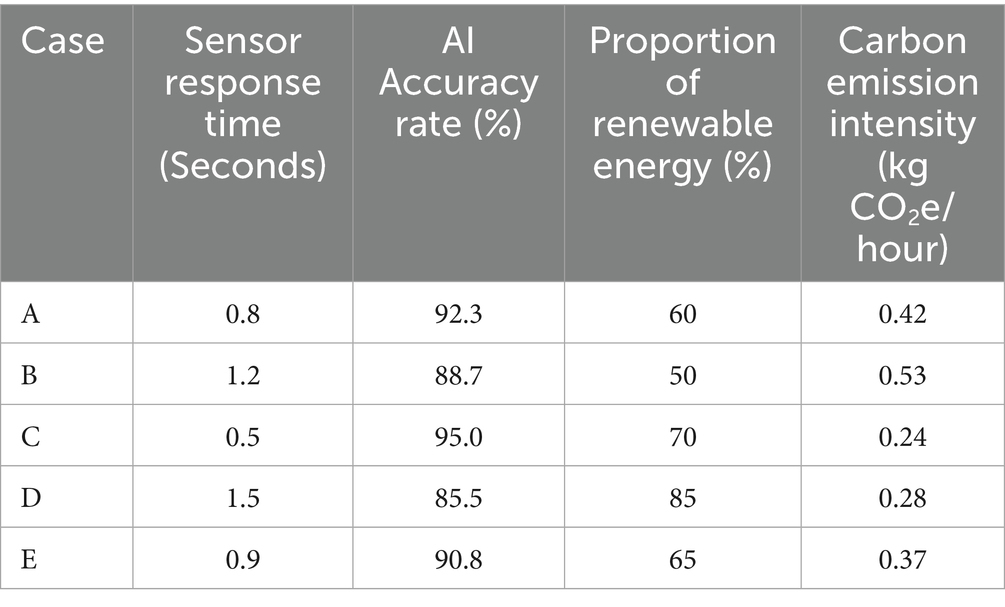 Table 7 provides detailed comparative data of five cases in terms of sensor response time, AI accuracy, renewable energy ratio and carbon emission intensity, which further supports the analysis of technical maturity and environmental adaptability of each case.