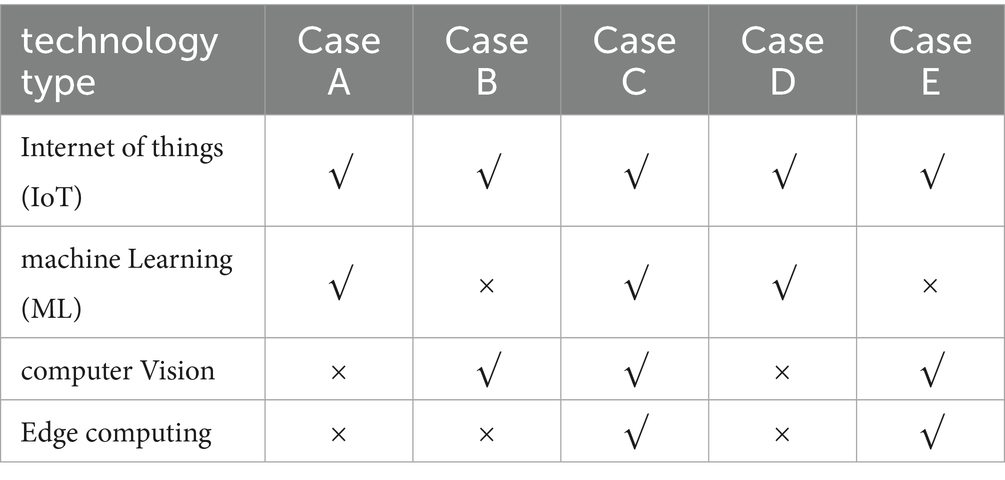 Further statistics on the application types of intelligent technologies in each case (see Table 8 for details) show that the Internet of Things (IoT) and machine learning (ML) are the mainstream technologies, but the differences in technology combinations between each case are very obvious.