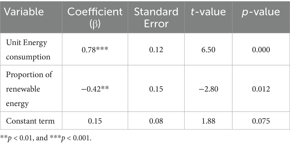 Through regression analysis (Table 10), there is a significant positive correlation between unit energy consumption and carbon emission intensity (β = 0.78, p < 0.01), which verifies the key role of energy efficiency in low-carbon targets.